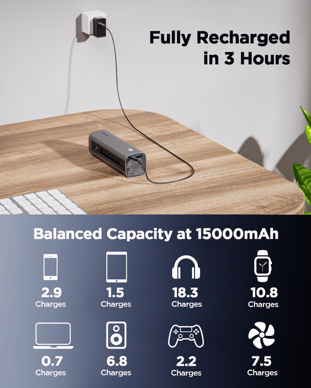 Fast Charging & High Capacity: QC3.0 and PD3.0 fast charging boost your charging speed up to 22.5W. Large battery capacity 15000mAh (3.2V/48Wh) charge your phone up to 3 times, making it perfect for extended use on the go. Rated capacity 8000mAh (5V/3A). 15000mAh at 3.2V (= 8000mAh at 5V).
