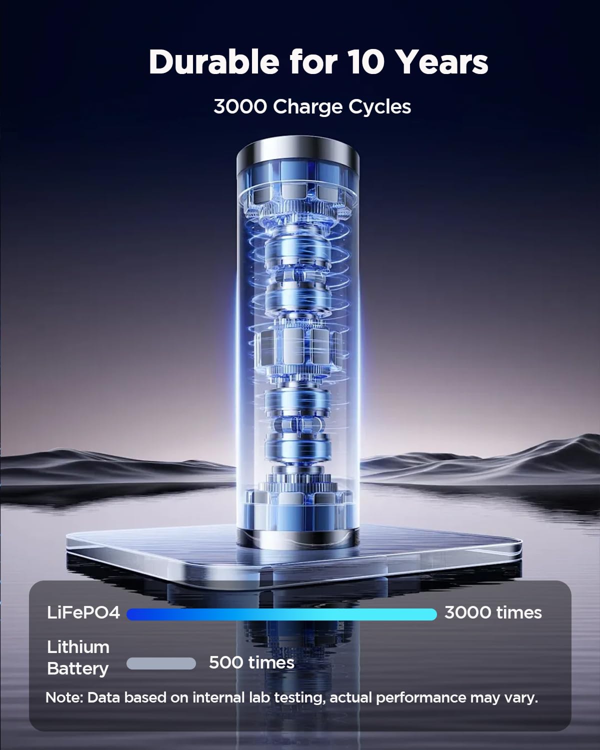 Superior Safety LiFePO4 Battery: The World's FIRST and ONLY advanced LiFePo4 battery on power bank, the same type used in Electric Vehicles, ensuring exceptional safety and reliability. With 3000 charge and discharge life cycles, it offers 10 years of durable performance.