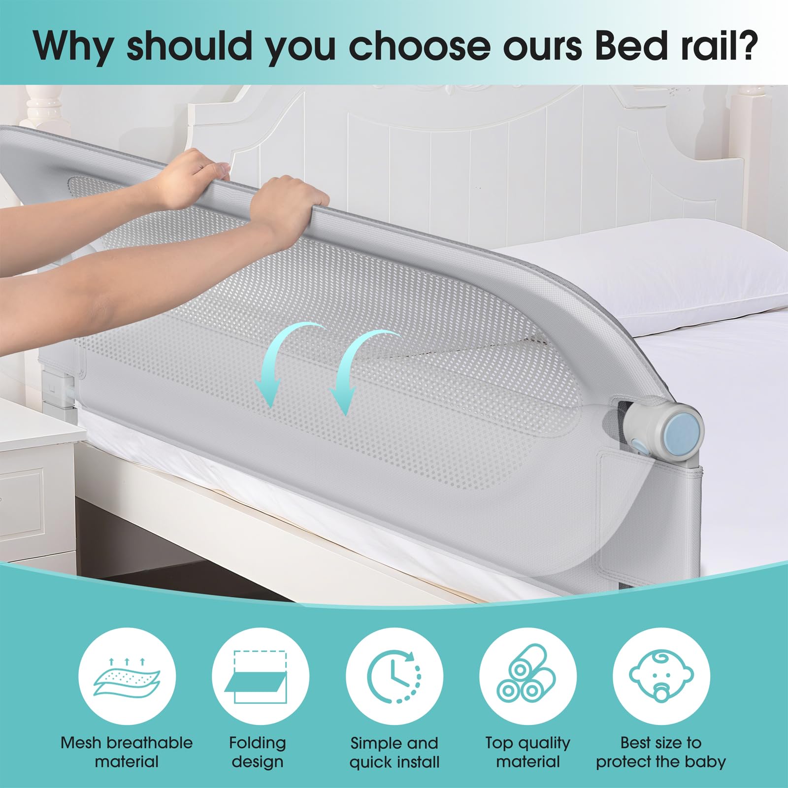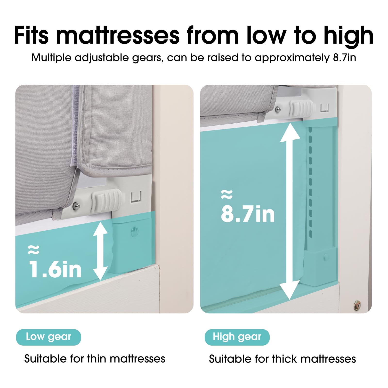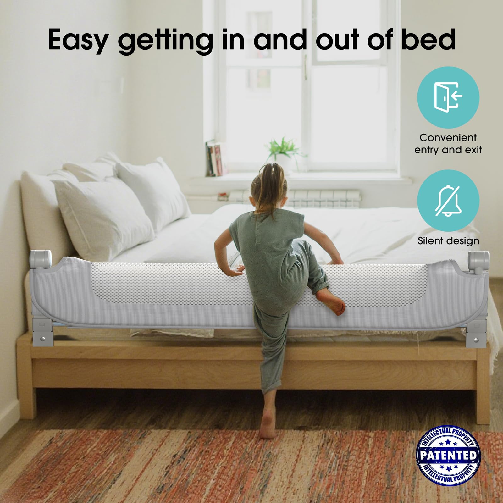 Swing-Down Design: Lets kids climb in/out independently. The silent fold mechanism operates smoothly (no annoying squeaks!), so lowering it won't wake a sleeping child. Unlike other rails, it tucks neatly against the mattress