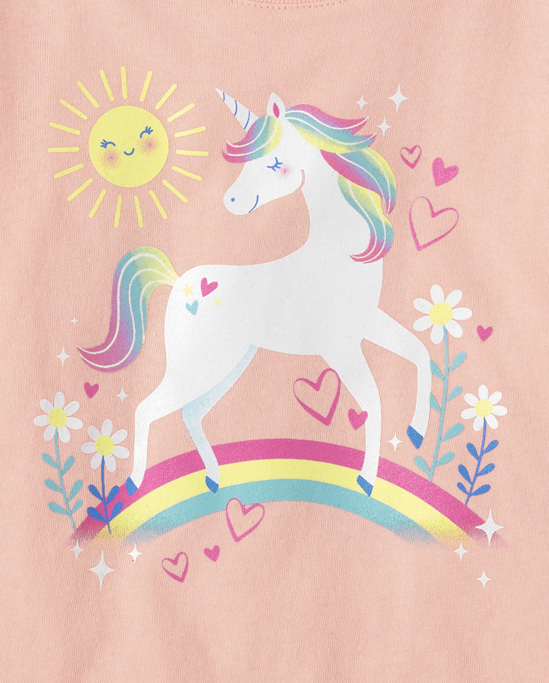 DESIGN — Features short sleeves, rib-knit crew neck and unicorn graphic design at front
