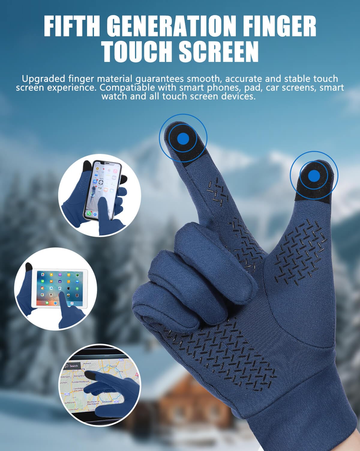 šćSensitive Touch Screen Fingertipć We've tested multiple conductive fabrics over and over again to achieve a more sensitive touchscreen experience. Our warm gloves for cold weather can keep your hands warm but still allow you to operate your phone. Don't miss important calls, deal with urgent work in time, and take pictures of beautiful scenery. Upgraded touchscreen material on the thumb and index fingers has better sensitivity and stability for any digital devices.
