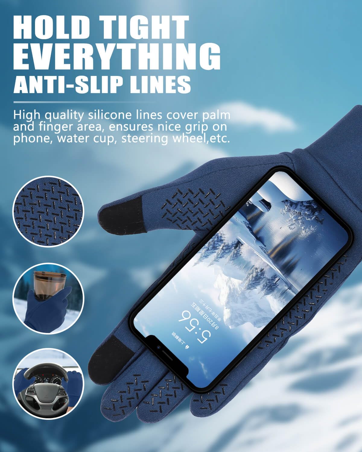 šćNon-Slip Palm Designć Covered with anti-slip design of big silicone lines on the palm and fingers, which effectively increases the grip and abrasion resistance of Aegend thermal winter gloves. You can grip things firmly to ensure safety. Such as gripping the steering wheel firmly when driving, and holding your phone well to prevent it from falling and breaking.