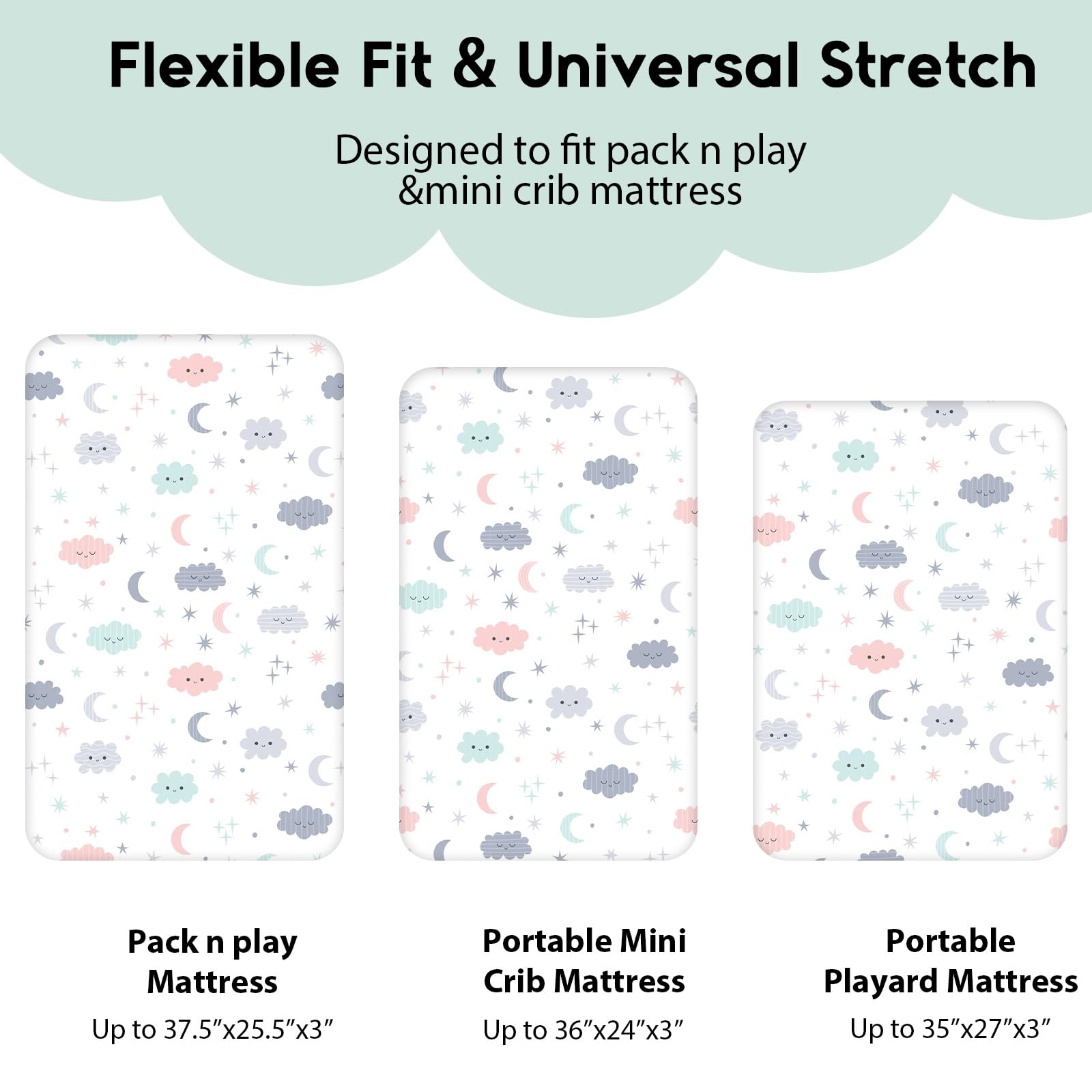 EASY CARE: These mini crib sheets are machine washable and will remain shape after wash, moms won't have to worry about shrinkage, fading, or pilling. Each package contains 2 x pack and play sheets, you will always got one on hand.