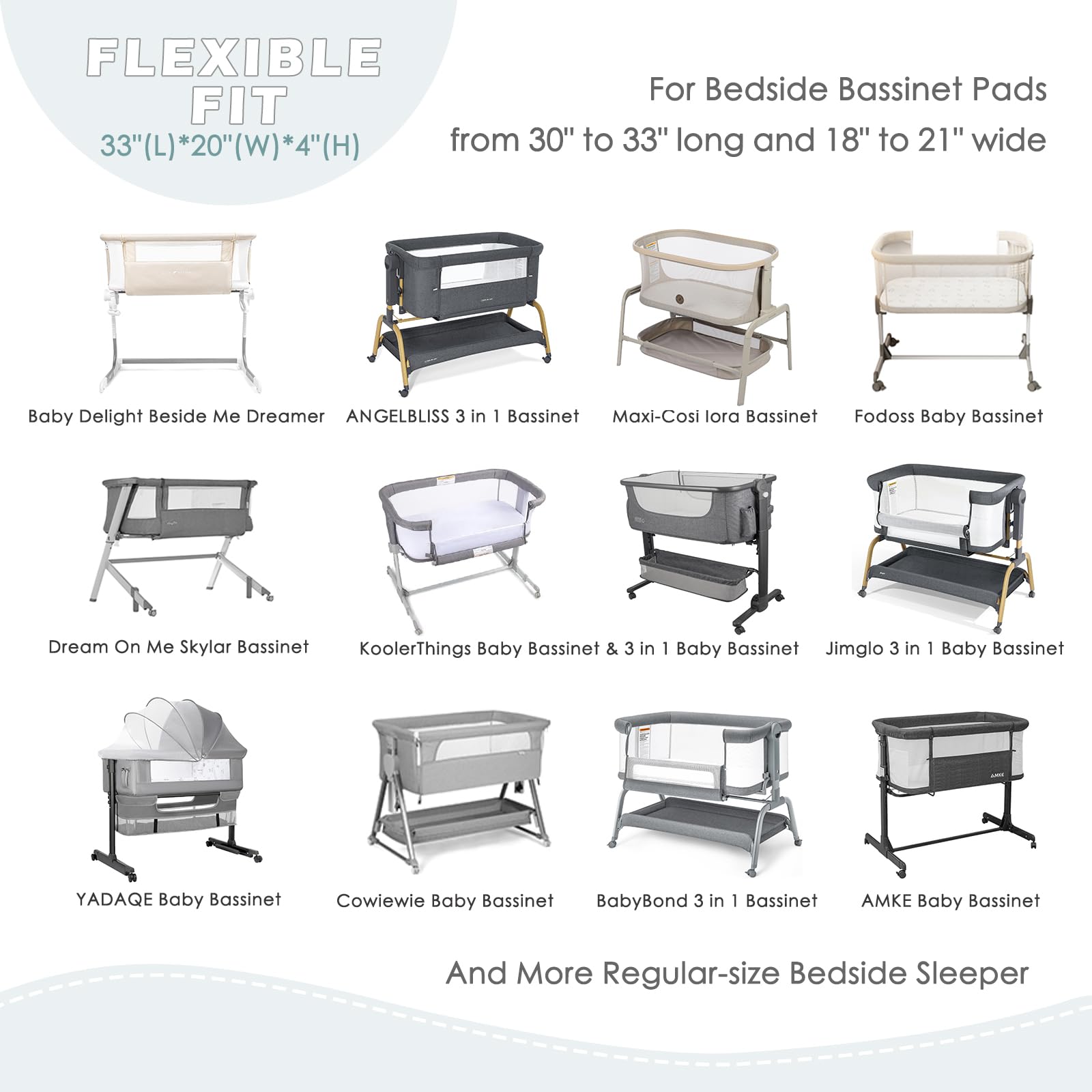 FLEXIBLE FIT - These bassinet fitted sheets measure 33x20 inches and made specifically for most regular-sized bedside sleeper bassinets such as Baby Delight Beside Me Dreamer, Dream On Me Skylar, Maxi-Cosi Iora and other rectangle bassinet mattress. With an elastic band around the bottom edge of each sheet to ensure a snug fit, these bassinet mattress sheets are flexible fit pads from 18" to 21" wide and 30" to 33" long