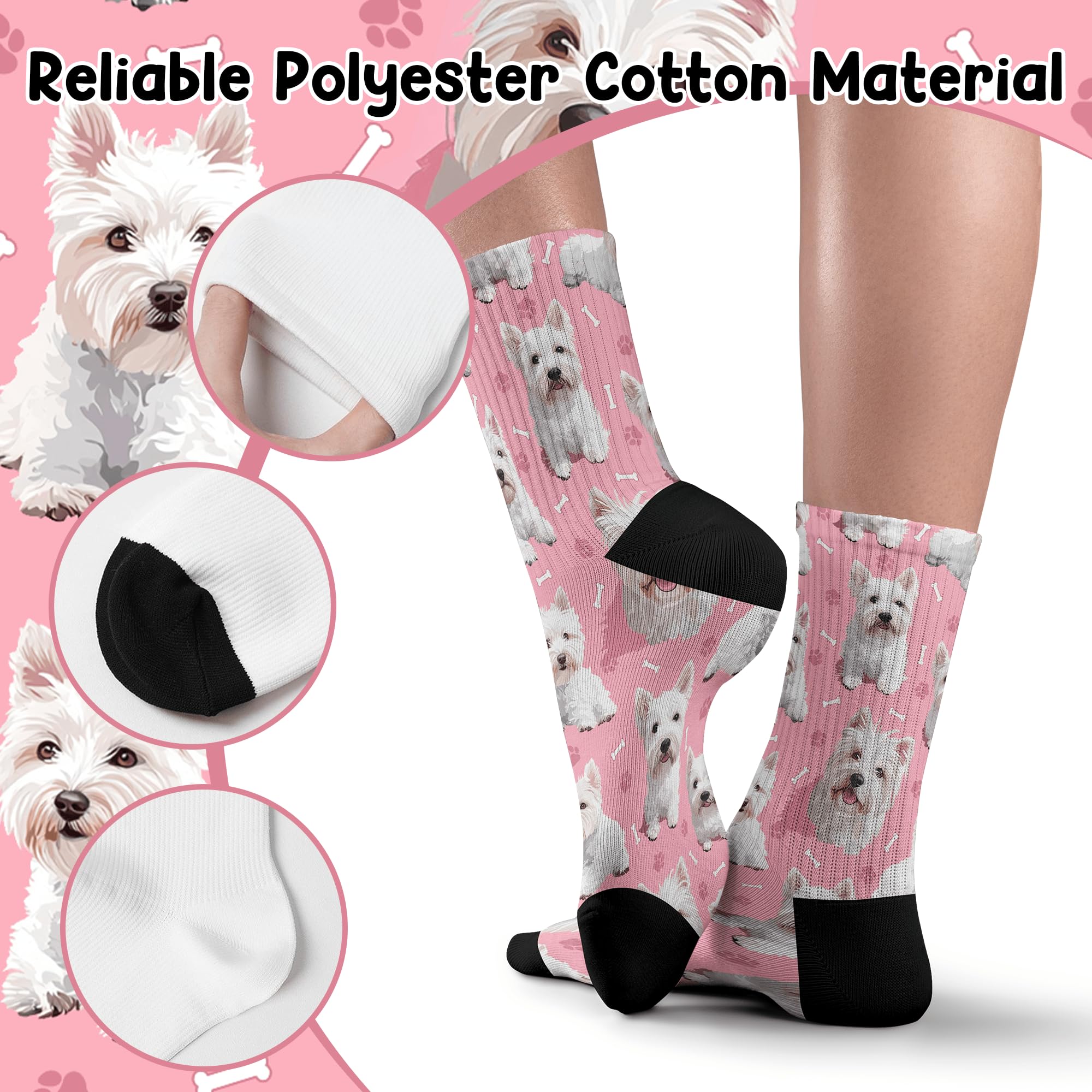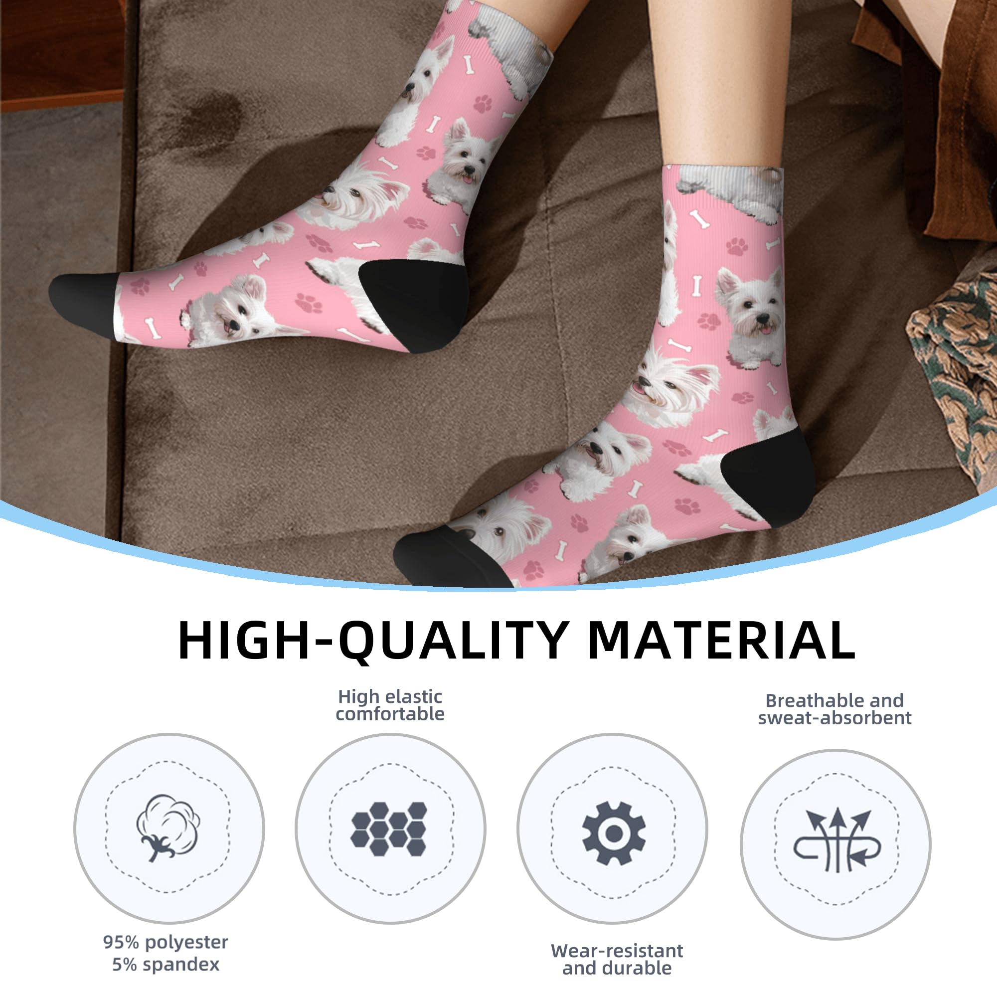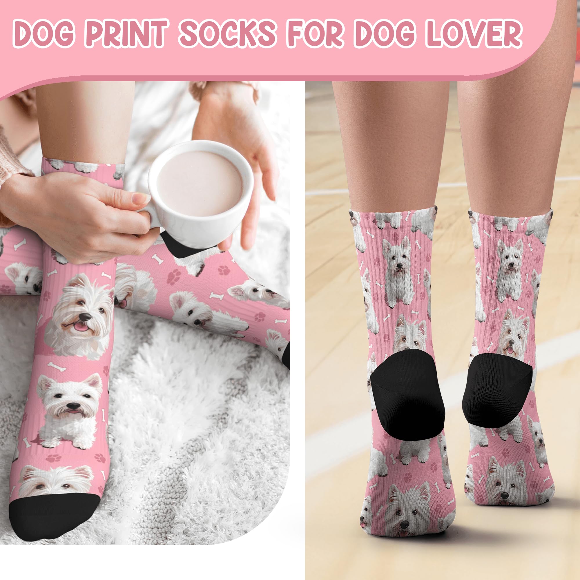 QUALITY MATERIAL: Our dog print socks are designed with a comfortable composition of 90% Polyester and 10% spandex for a flexible fit. They won't fade and are machine washable.