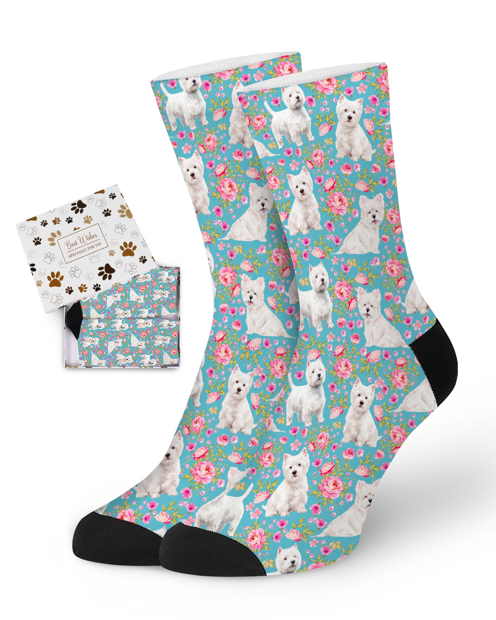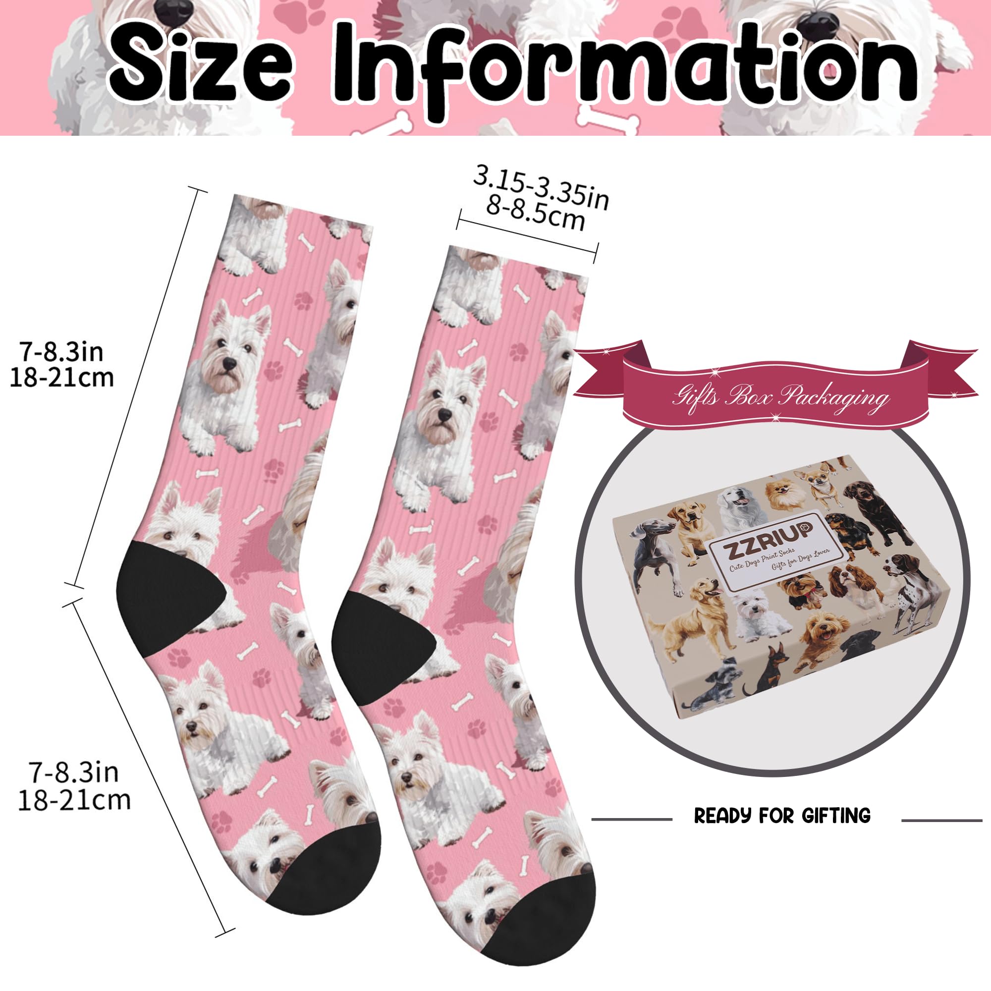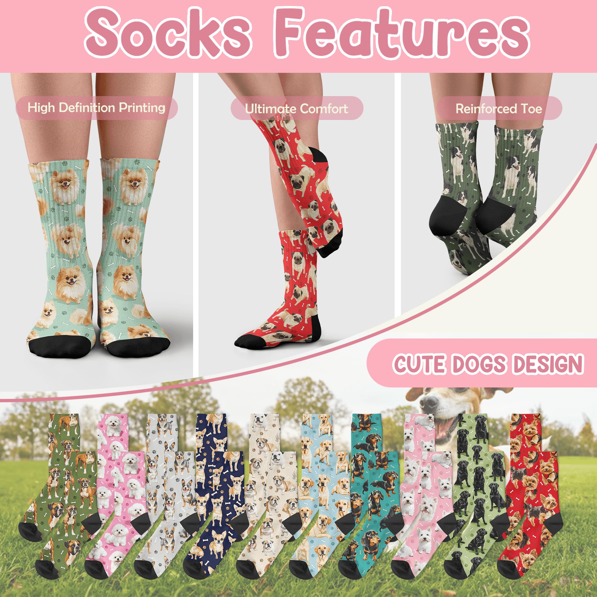 QUALITY MATERIAL: Our dog print socks are designed with a comfortable composition of 90% Polyester and 10% spandex for a flexible fit. They won't fade and are machine washable.