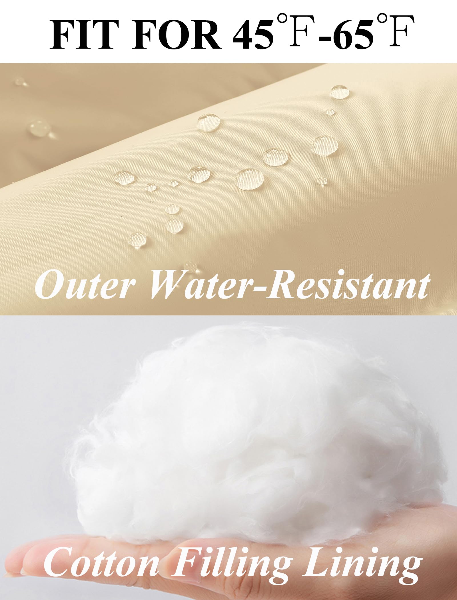 Water Resistant: Featuring a water repellent fabric, this thermal vest finish sheds light rain and snow. It is filled with 100% cotton that is more puffy and insulated. Suitable for temperatures between 45°F and 65°F