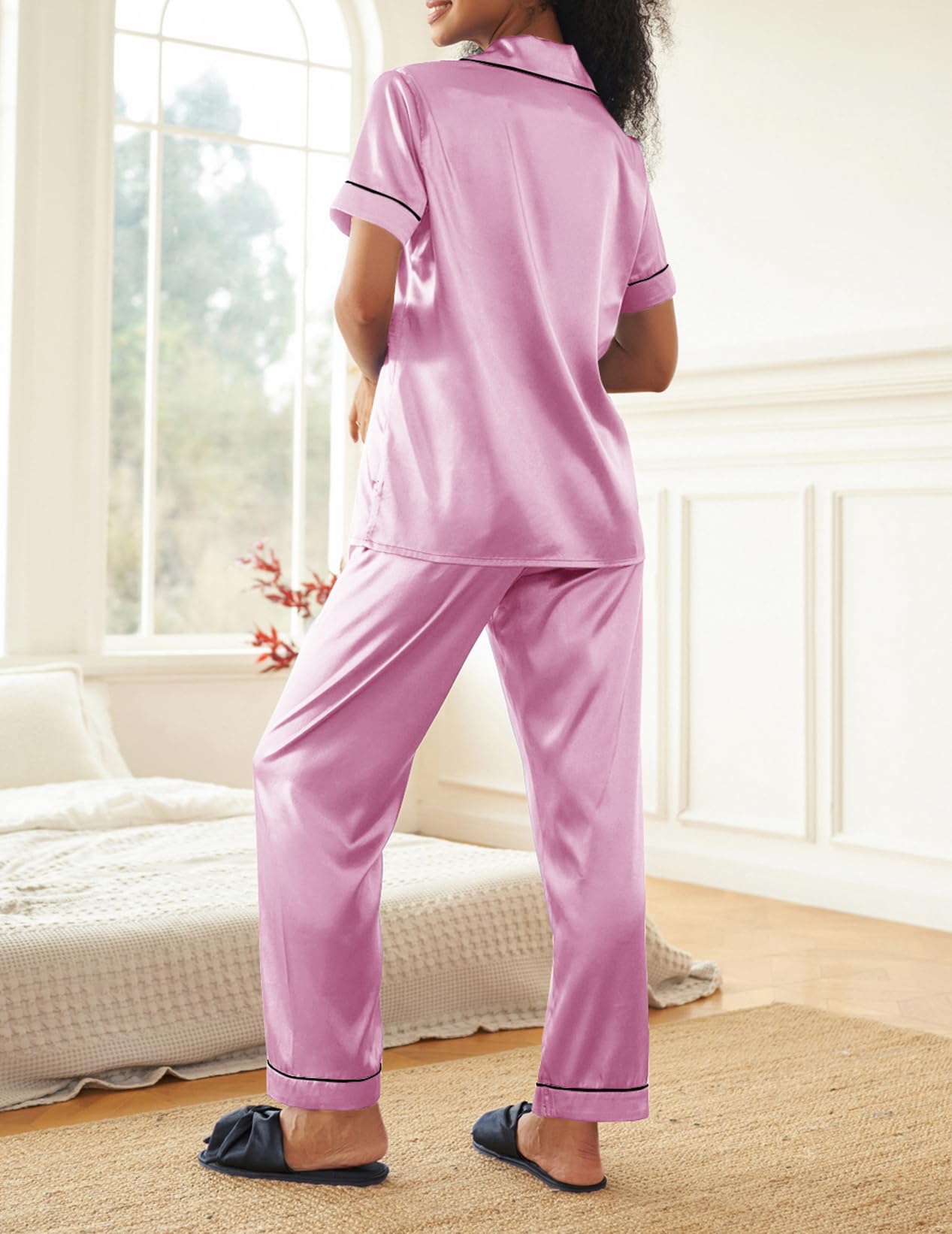 Features: The satin pajamas tops features button design,classic notch collar,chest pocket,short sleeve and casual style. The women pjs pant is designed with elastic waistband.