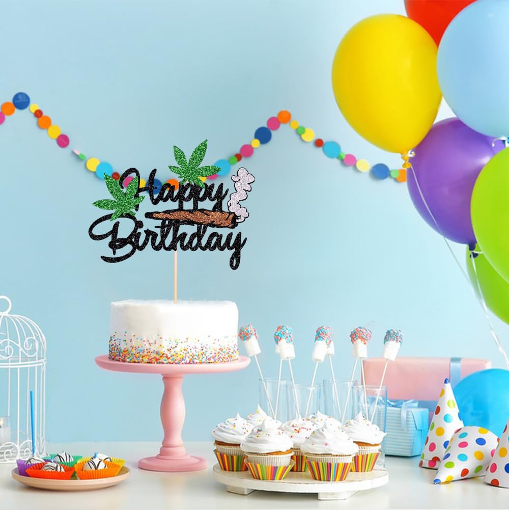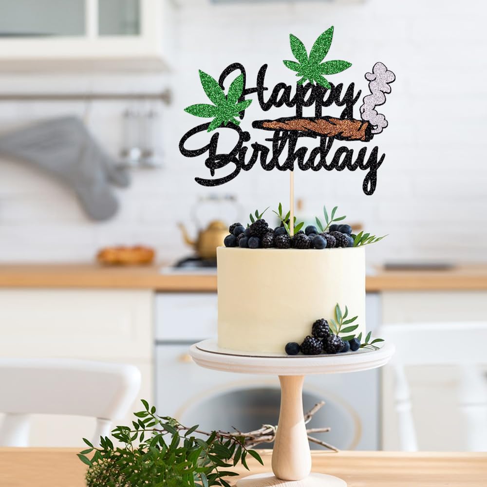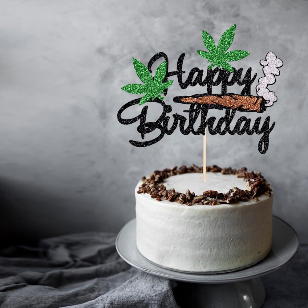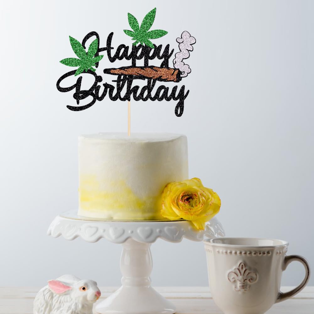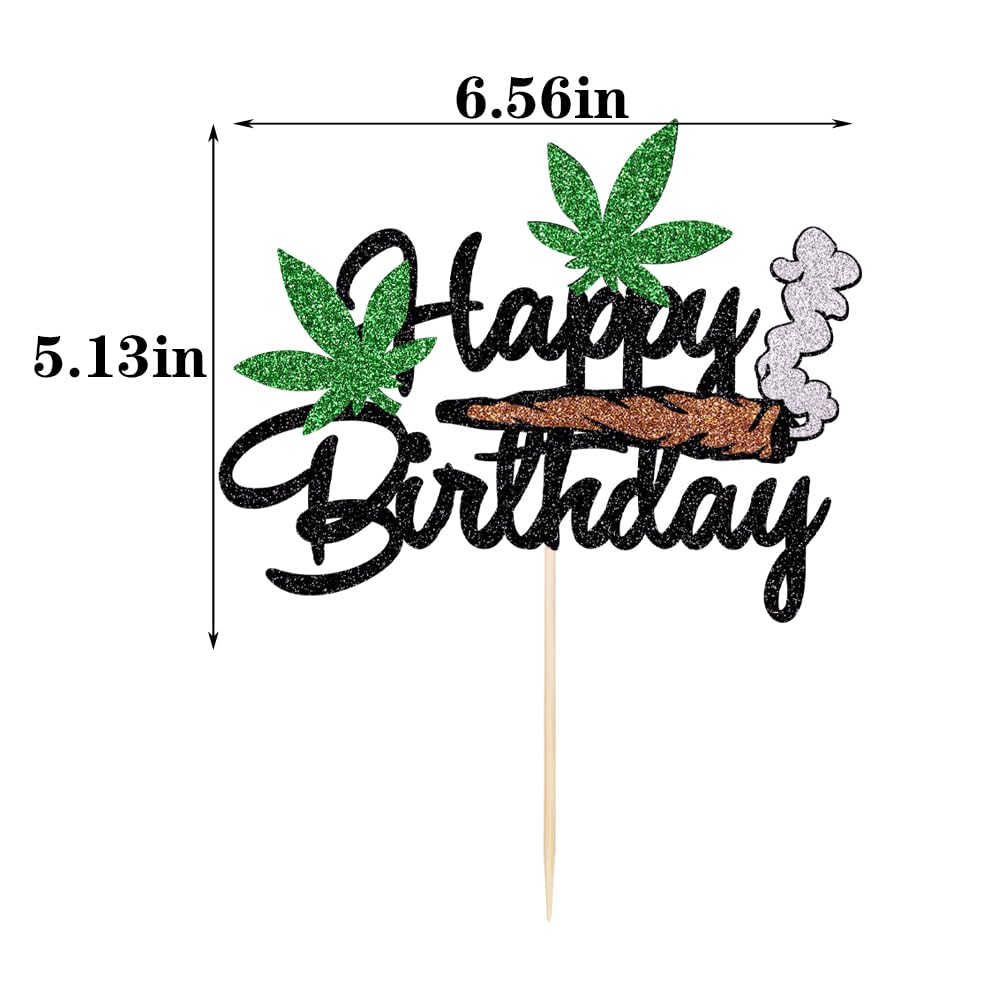 Happy Birthday Cake Topper - Black Glitter Weed Leaf Cake Decoration Supplies - For Men Or lady Birthday Party Decorations
