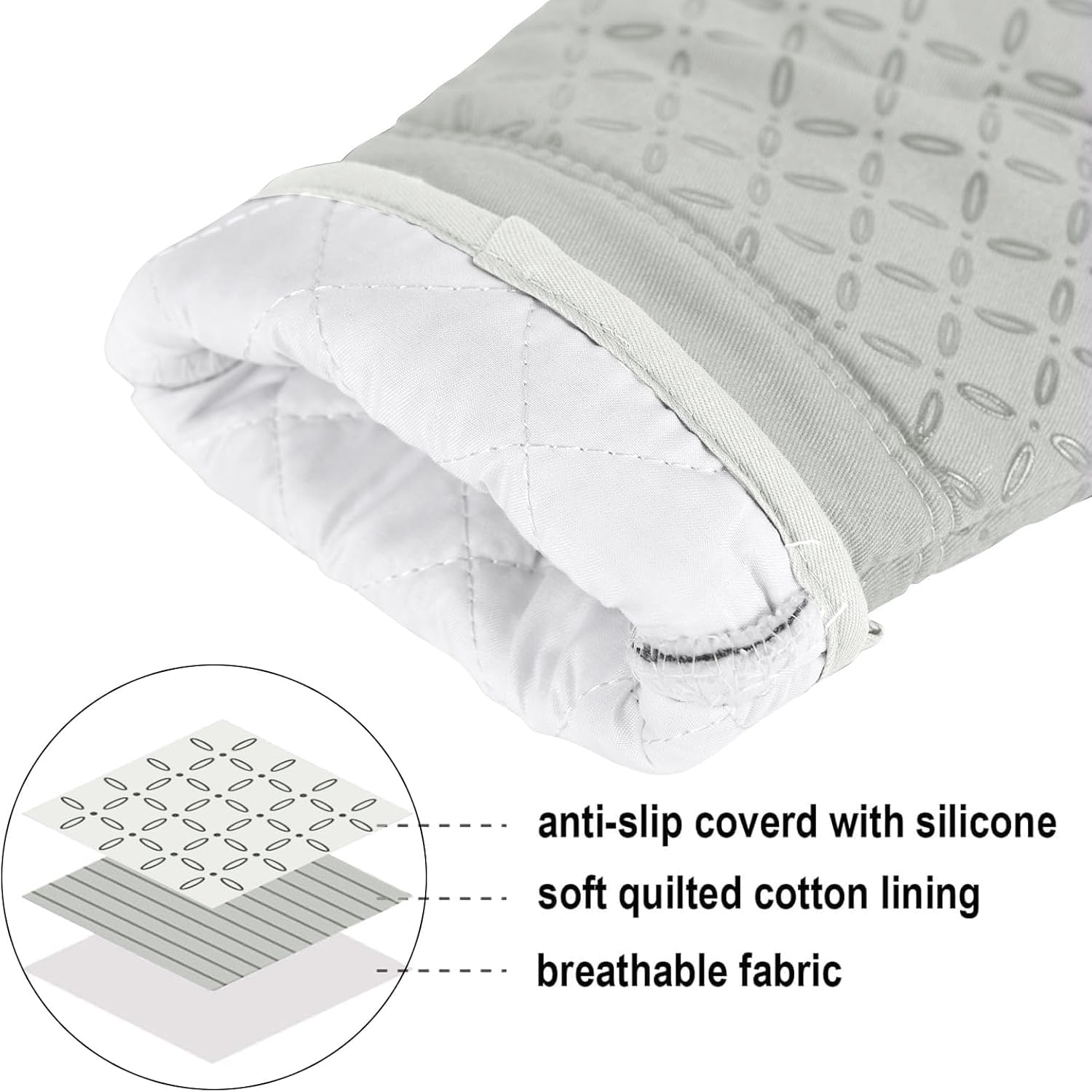 500°F HEAT RESISTANT &NON-SLIP: This oven mitts heat resistant 500 degrees because of the durable construction so it can effectively keep you protected from burning while you enjoy cooking and grilling. Enhanced with anti-slip silicone design to provide a more robust, non-slip grip that can be held securely when handling the kitchen utensils