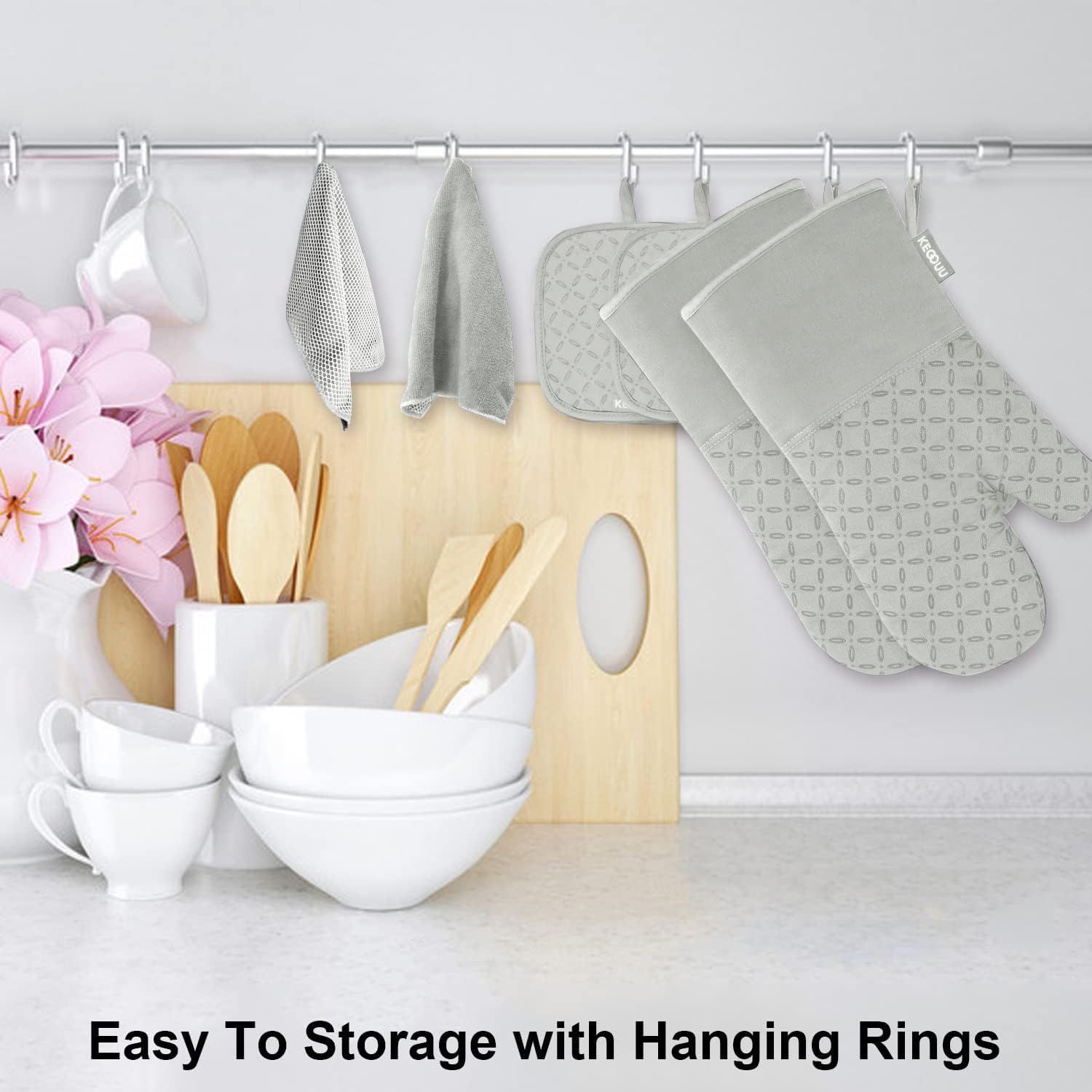 EASY TO STORE: The kitchen oven mitts and pot holder come with rope design, so it is easy to store and hang them via the suspension rings when you are not using, save your room and make your kitchen look more cleaner