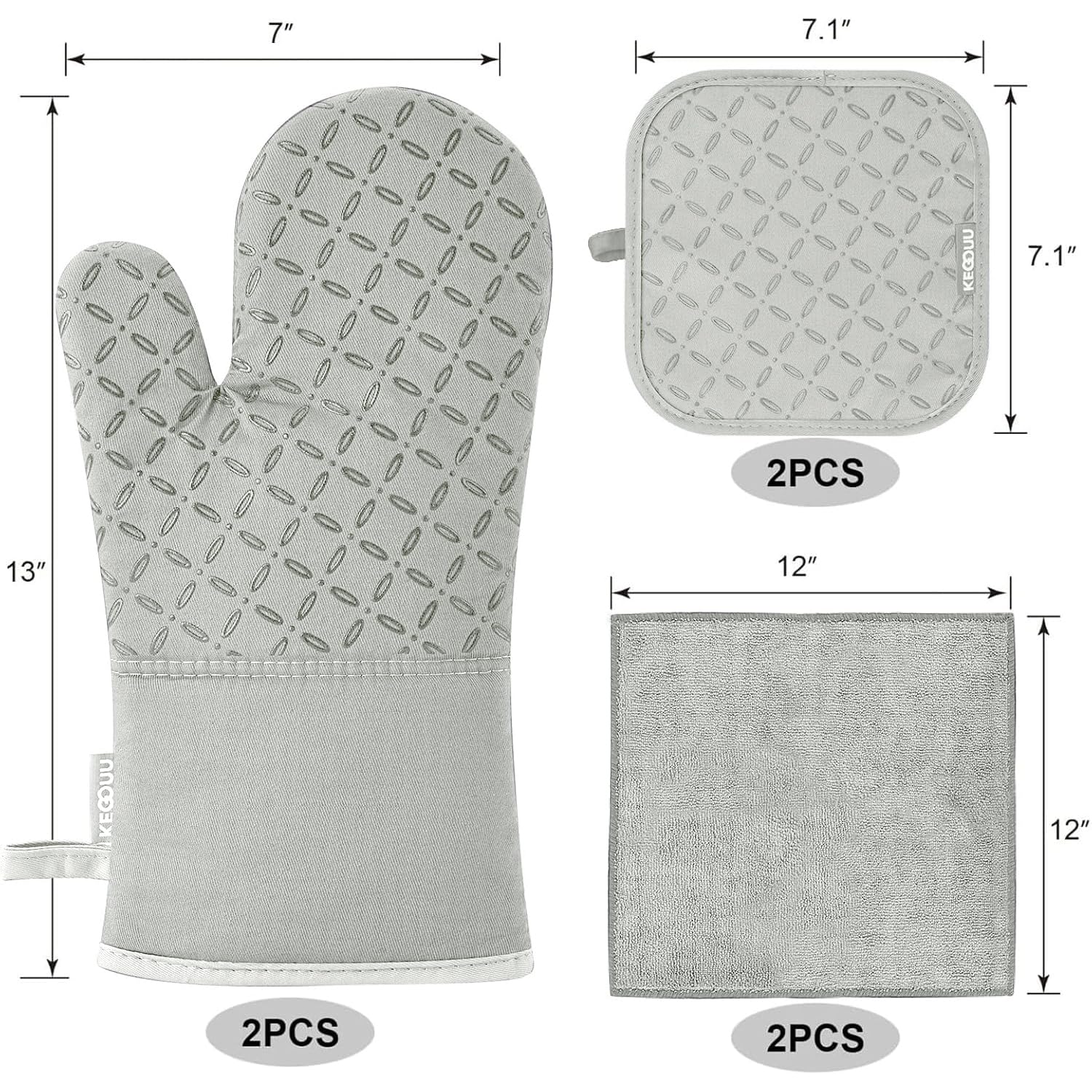 6 PIECE KITCHEN ACCESSORY SETS: Our oven mitts and pot holders set including 2pcs non-slip surface silicone kitchen oven gloves (7X13in), 2pcs pot holders (7X7in) and 2 kitchen towels (12x12in), fit for indoor cooking, baking,BBQ or outdoor grilling. Also the oven mitt set is a perfect ideal kitchen gift for women, men, baker, cooker