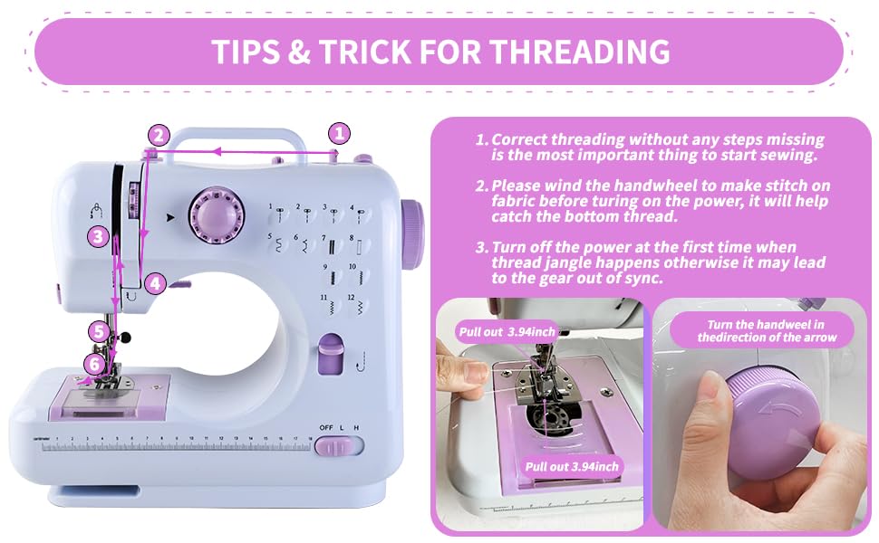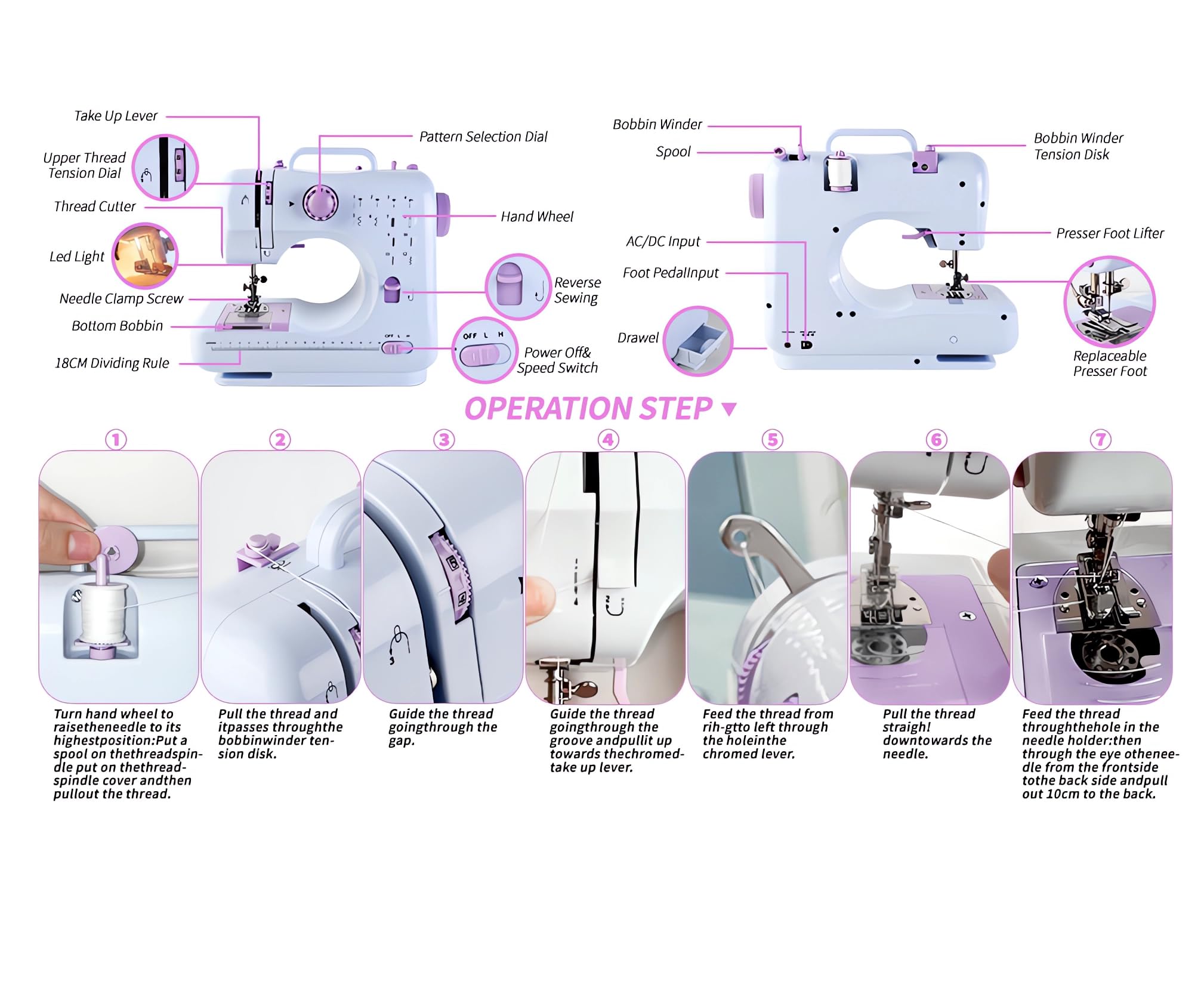 [Sewing Machine User Guide] There are threading indication marks printed on the body, which can help you easily thread the thread. Whether you are a beginner or a sewing enthusiast, please watch the use video carefully before using it, which can help you create works more easily.