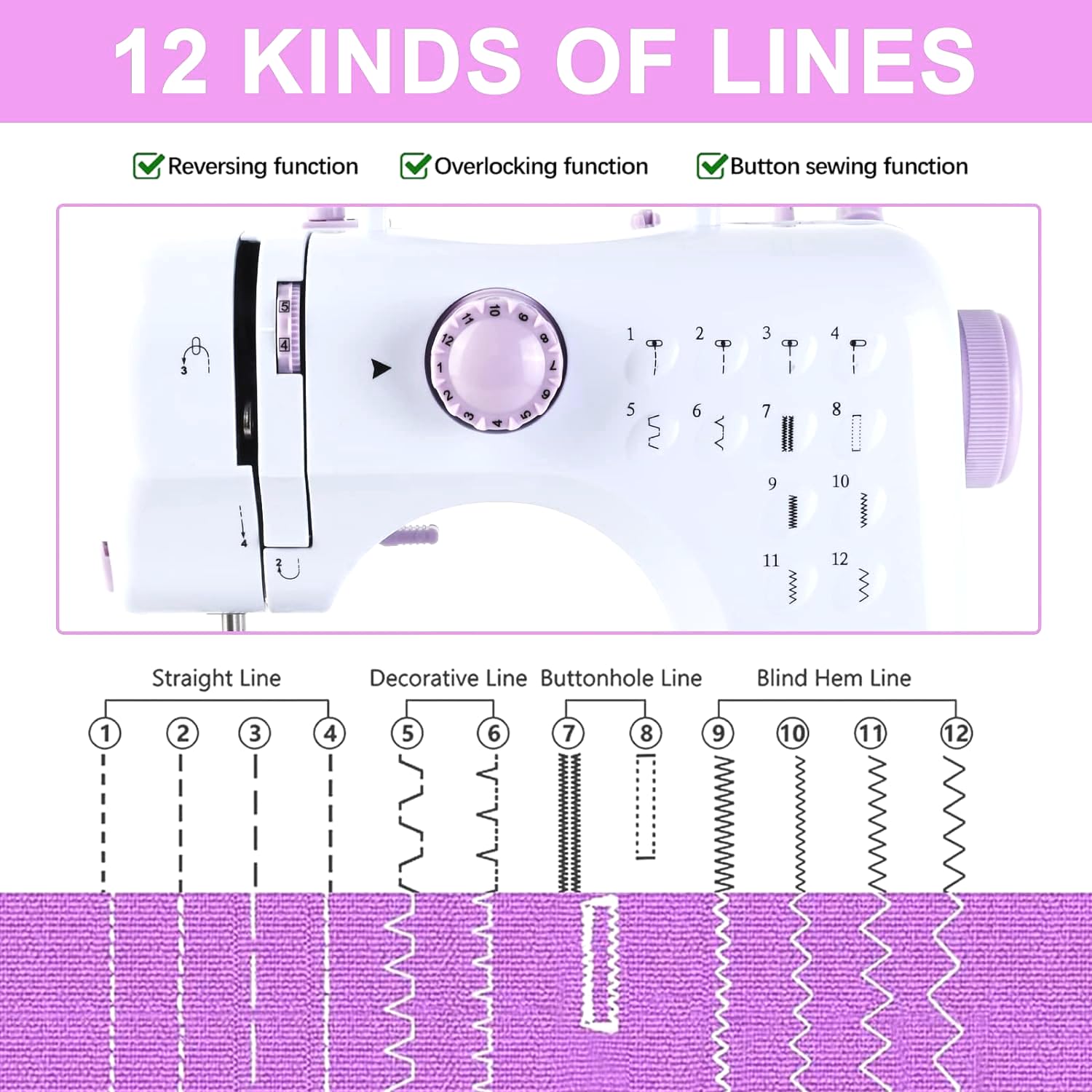 [Sewing machine 12 kinds of stitches and reverse stitching] Our household sewing machine has 12 kinds of stitches, 1-4 is the adjustment stitch length, 5/6 is the pattern stitch, 7/8 is the lock stitch, 9-12 is a curve stitch, just adjust the knob to the corresponding number, you can use the corresponding stitch.