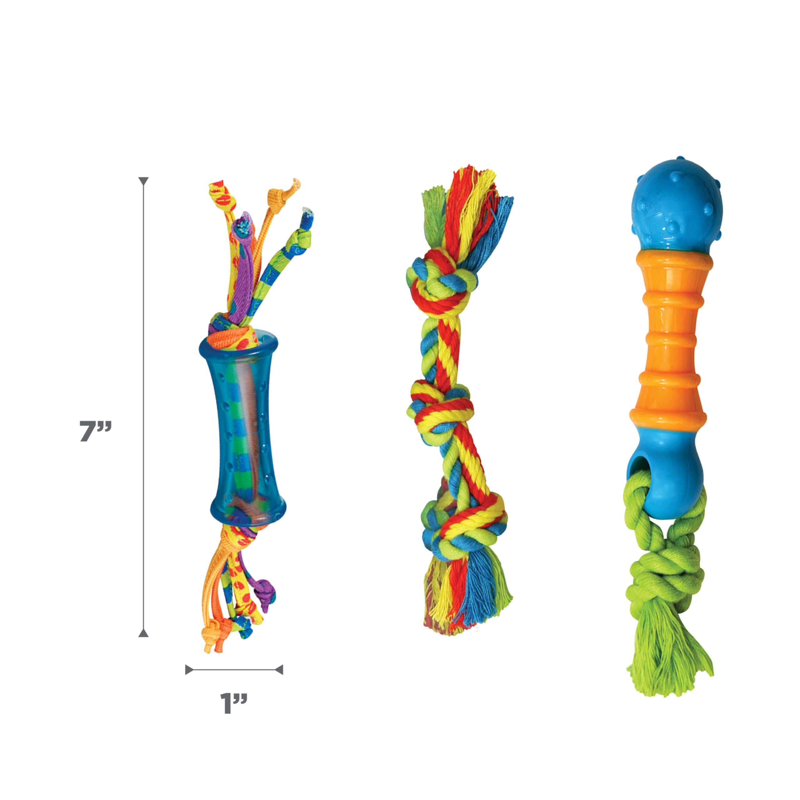 The Petstages Orka Mini Dental Chew Pack is a trio of brightly colored chew toys designed for puppies and small dogs.The Orka TPE rubber ridge design helps massage gums and clean teeth while cotton rope helps remove soft tartar as your dog chews. Great for solo or interactive playtime