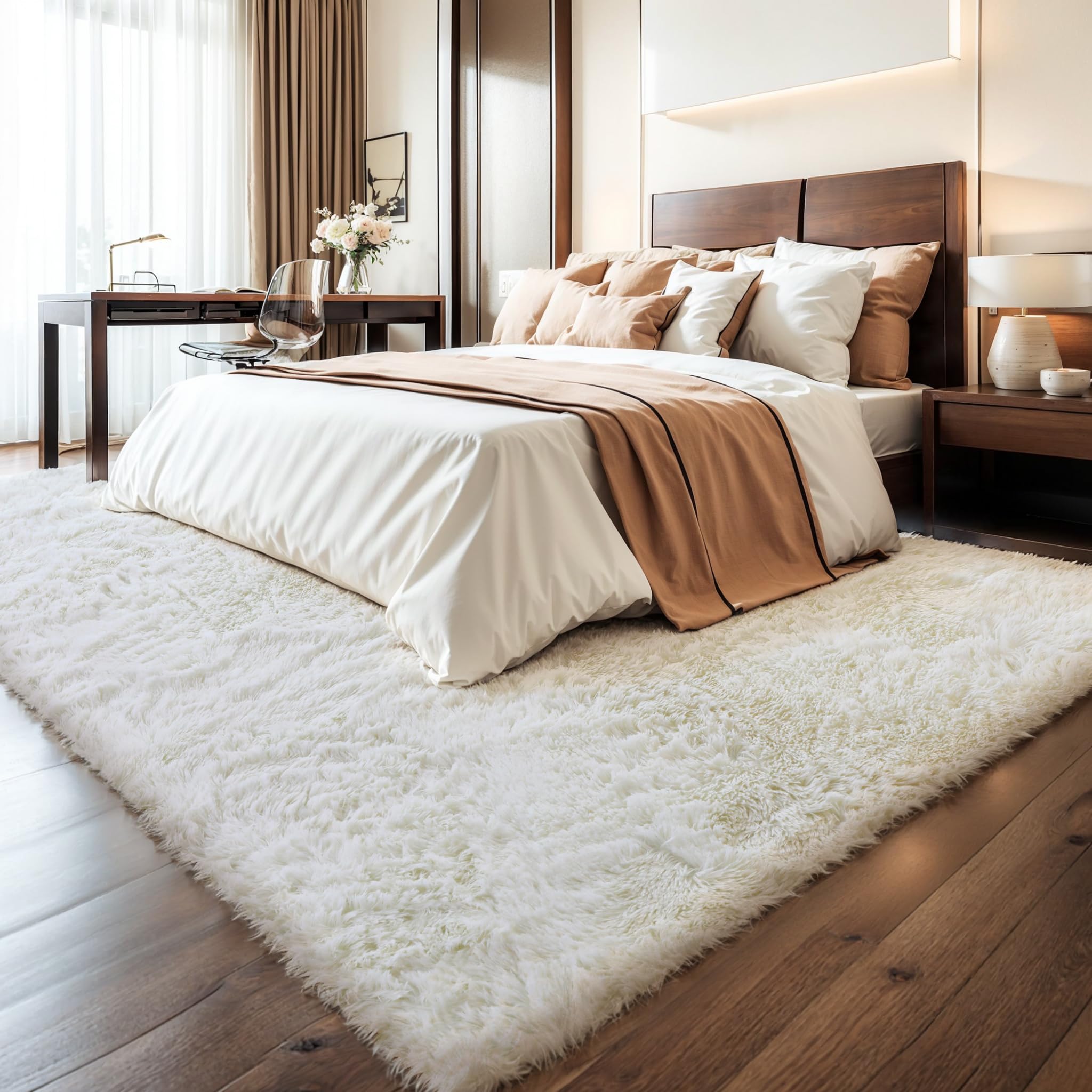 Supreme Softness & Luxurious Comfort : Step into unmatched softness with our shaggy fuzzy rug, crafted from premium velvet fibers that deliver a silky-smooth, plush texture. Designed with a thick 1.65-inch high-pile surface and a 0.75-inch cushioned memory foam layer, this luxurious area rug is twice as thick as most competitors, offering exceptional comfort with every barefoot step. Whether you're waking up to a soft landing, lounging in the living room, or playing with kids and pets, this cozy, ultra-plush carpet enhances warmth, reduces noise, and creates a peaceful, inviting atmosphere in any space.