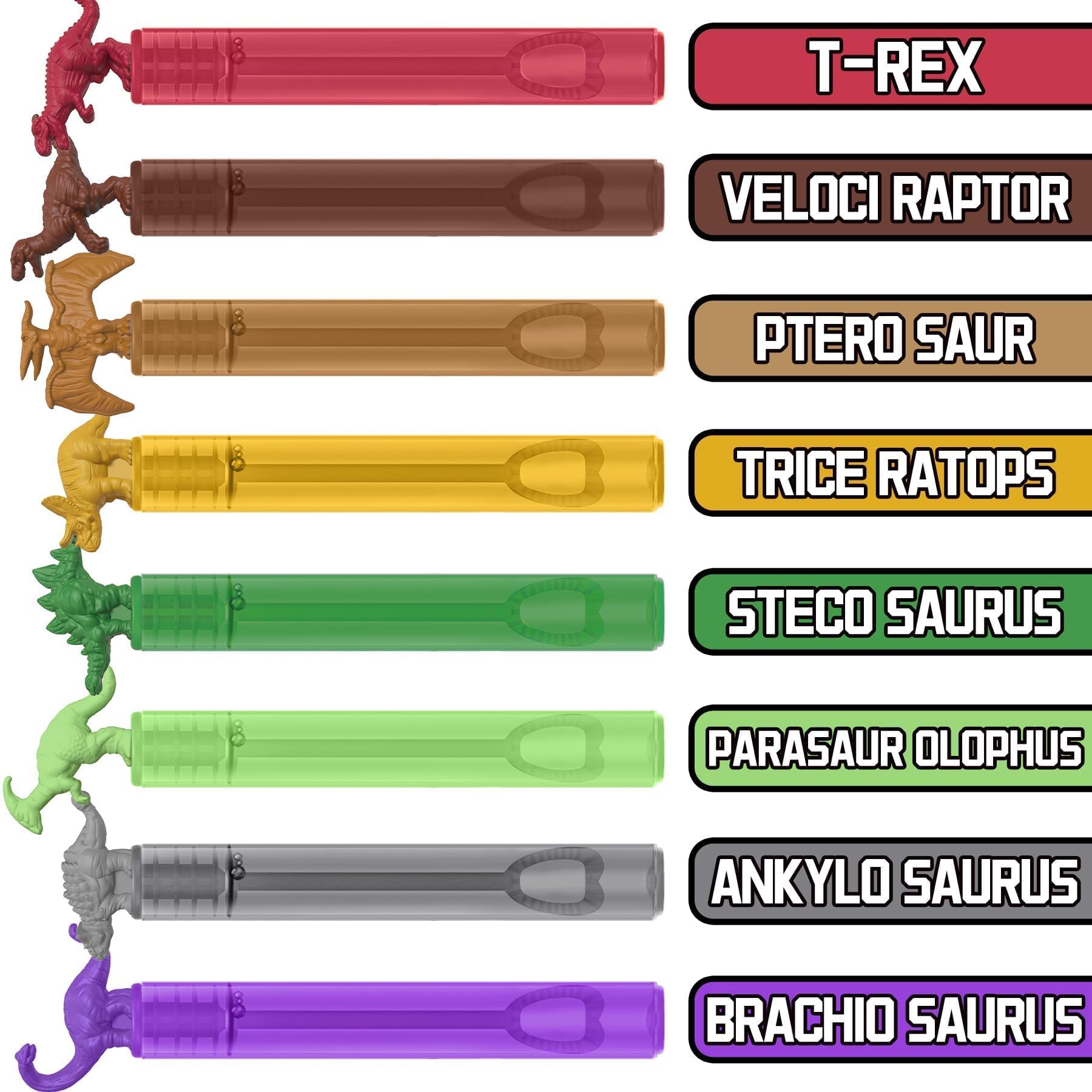 Dinosaur Design: 32pcs mini bubble Wands bulk (8 designs, 8 colors), makes kids feel like walking into the real dino world. Neon color bubbles open up outdoor play time; everyone deserves to have themed creative toys