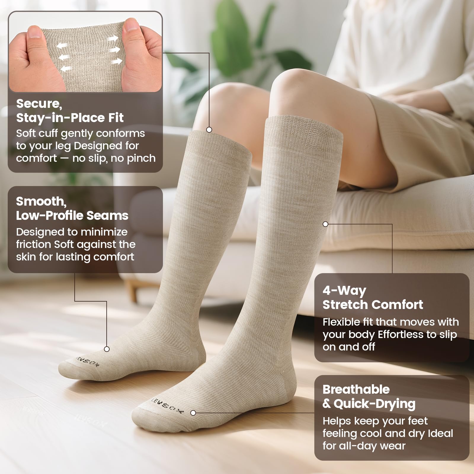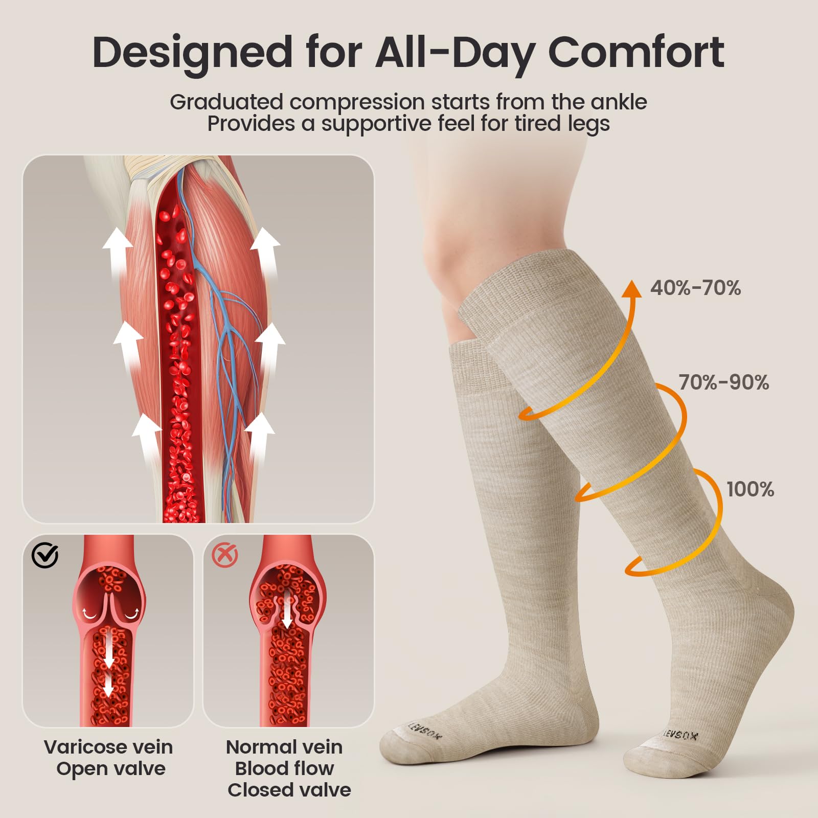 Merino Wool for All-Season Comfort: Crafted with 32% Merino Wool, these knee high compression socks help regulate temperature and wick away moisture. The breathable, skin-friendly fabric keeps feet comfortable in both warm and cool conditions