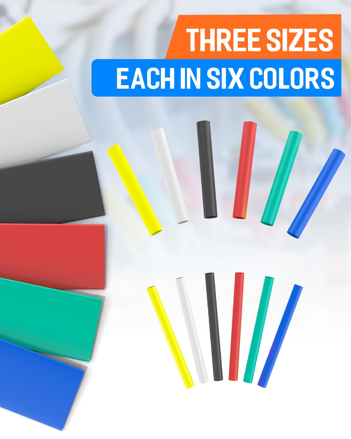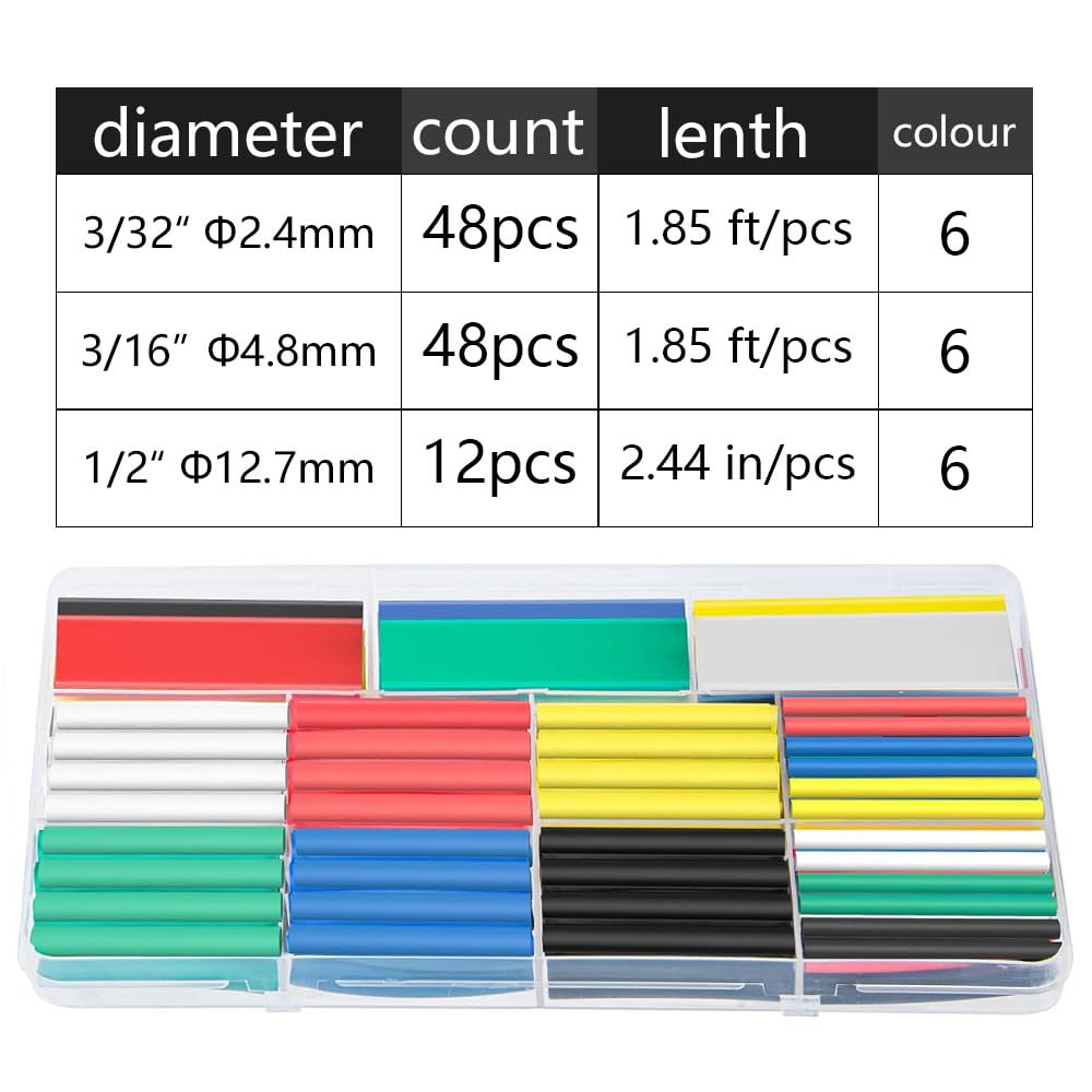 SPECIFICATIONS & QUANTITY: Eugiichr Heat Shrink Tubing Kit contains 12 pcs of 1/2" (2.44" long), 48 pcs of 3/16" (1.85" long) and 48 pcs of 3/32" (1.85" long), This heat shrink tubing kit includes three diameters, each in six colors (black, red, blue, yellow, green, white). With a 3:1 shrink ratio, it fits wires ranging from 0-1/2 inch in diameter. The total length is 17 feet