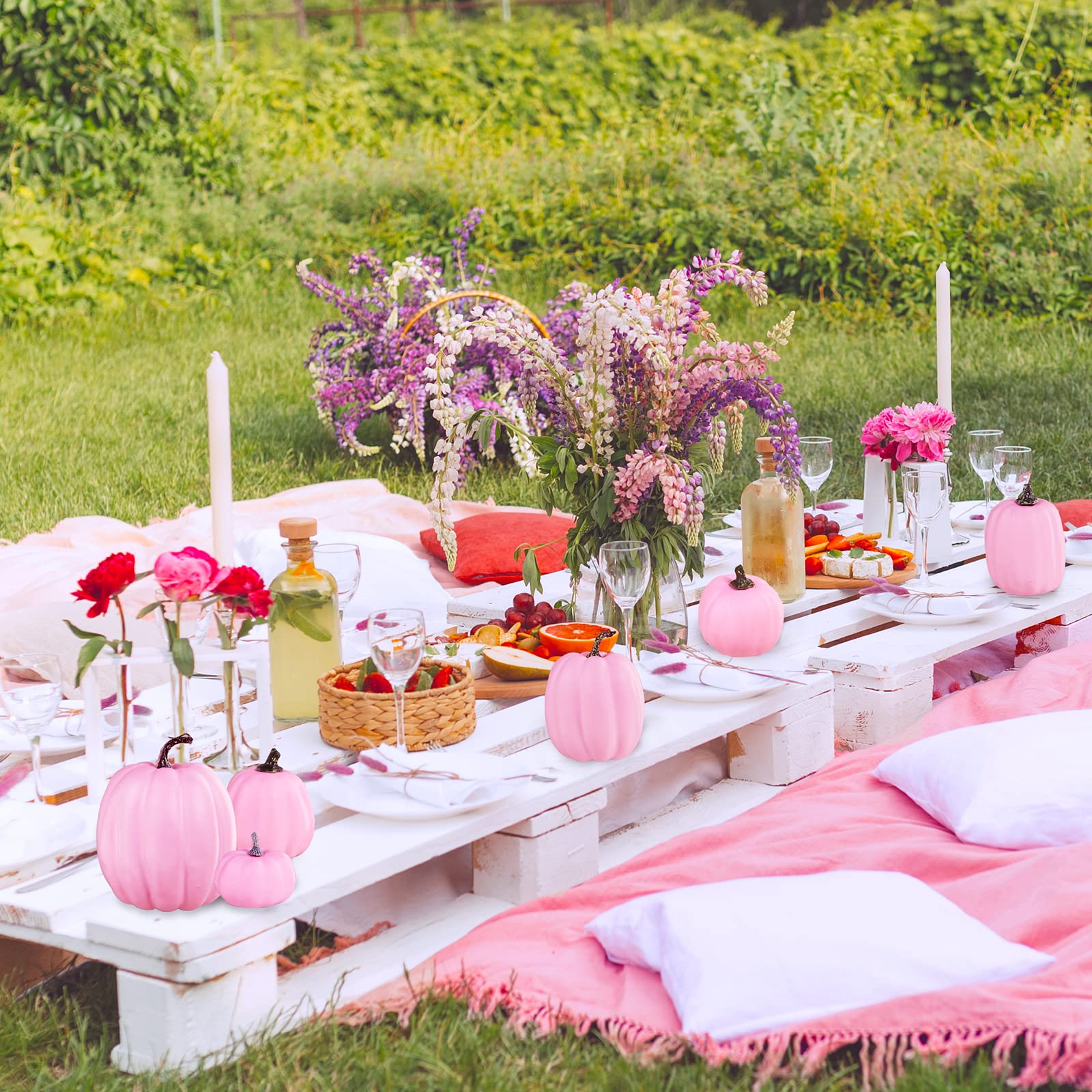 Assorted artificial pink pumpkins can be placed on tabletop, fireplace mantel, dining table, coffee table, entryway table, kitchen counter, windowsill, shelves or anywhere that fits. Use them for fall table centerpiece, autumn wedding tablescapes, seasonal bowl displays, place card settings, fall wreaths, fall baby shower decor, pink Halloween decor, fall front porch display, photo props and more. They are also great gifts for a wedding, housewarming, baby shower, birthday, holidays and so on.