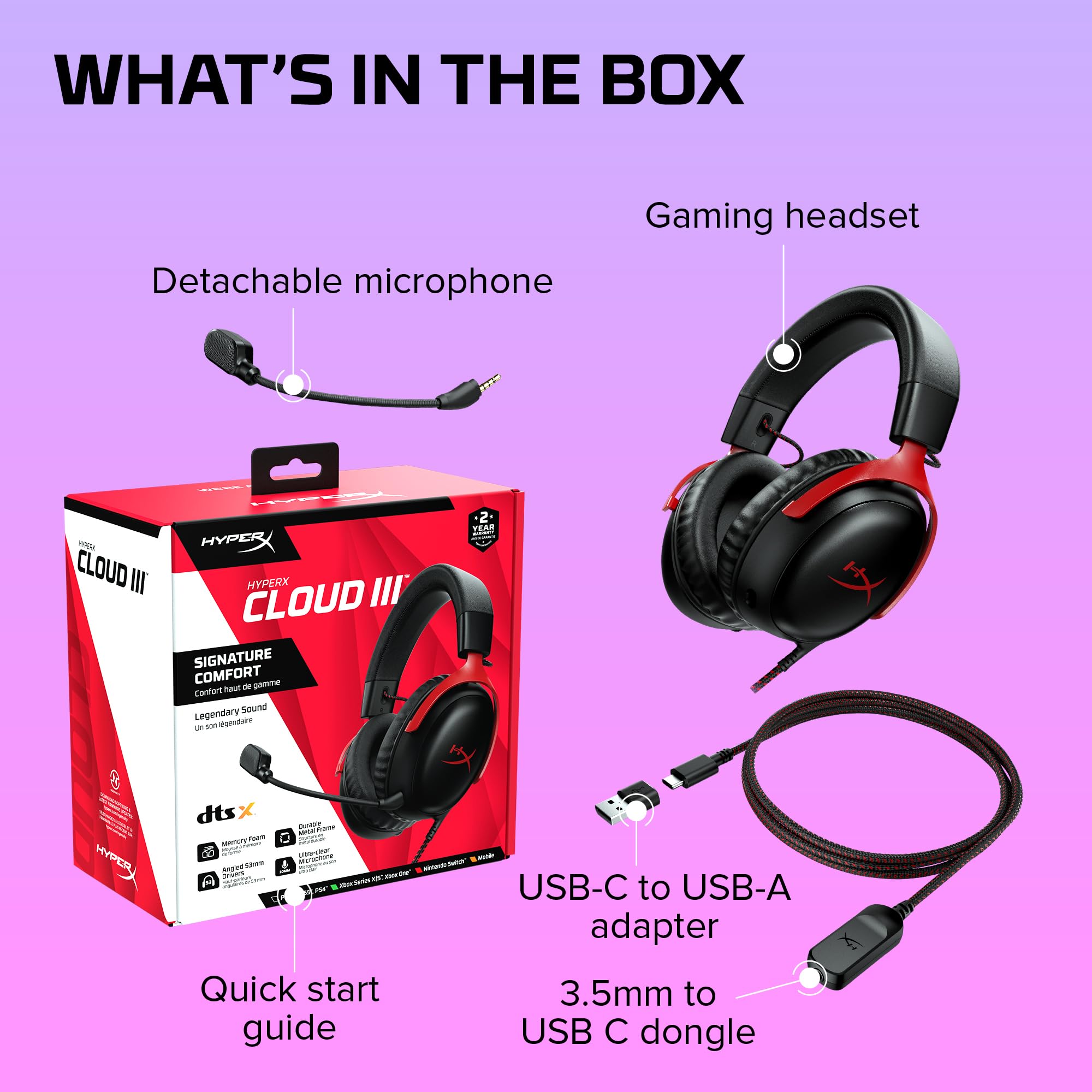 HyperX Cloud III – Wired Gaming Headset,PC,PS5,Xbox Series X|S,Angled 53mm Drivers,DTS Spatial Audio,Memory Foam,Durable Frame,Ultra-Clear 10mm Mic,USB-C,USB-A,3.5mm – Black/Red,(Pack of 10)