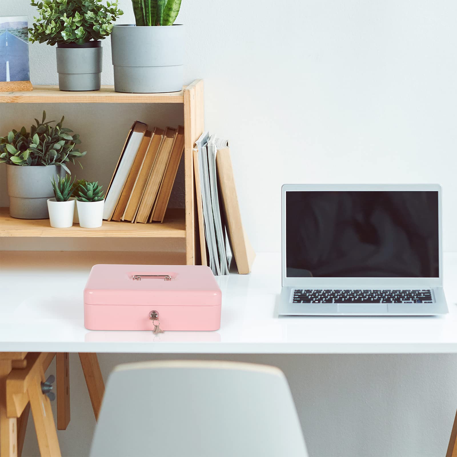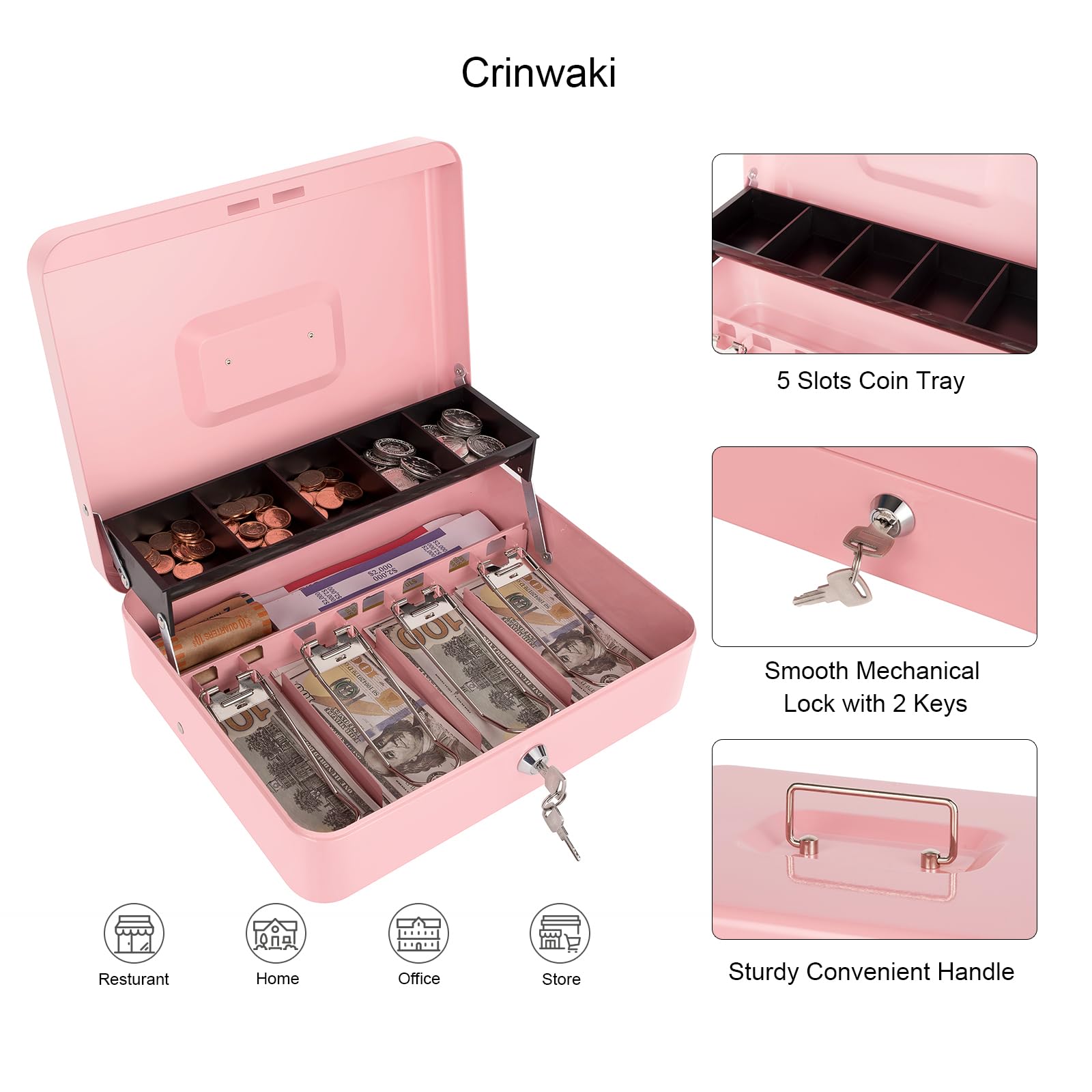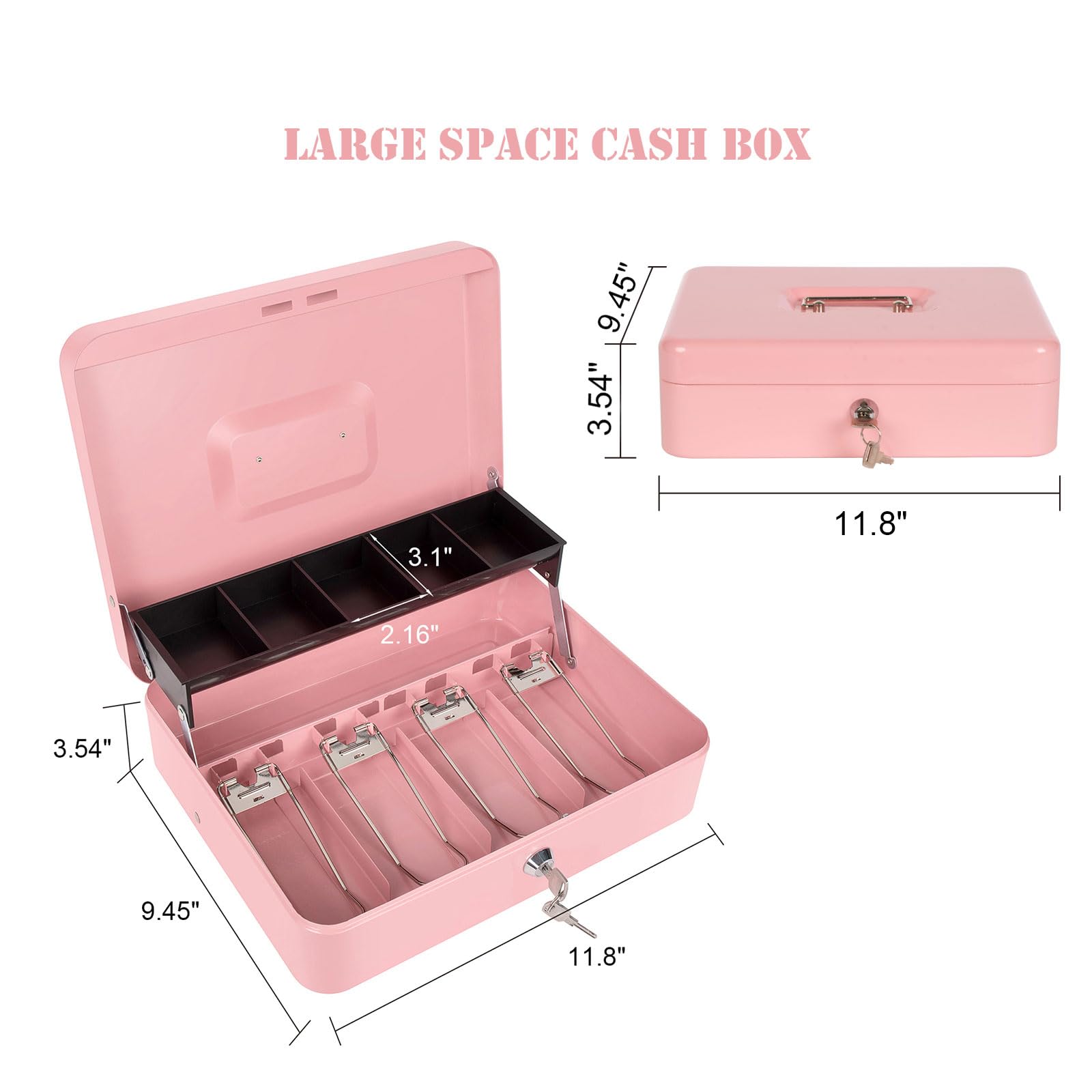 SECURE CASH BOX: Our cash box with money tray is designed with two tiers, the coin tray has five slots comes over the cashbox when it's opened, below the coin tray is the cash storage area with four slots, along with extra space at the bottom for storing checks, receipts, coin rolls, etc. Making it a well designed lock box to keep your valuables safe and well organzied.