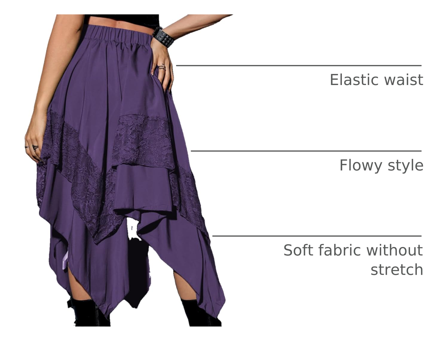 Elastic Waist, Lace Trim, Asymmetrical High Low Hem, A Line, Flowy, Gothic Steampunk Skirt, Casual Midi Skirt