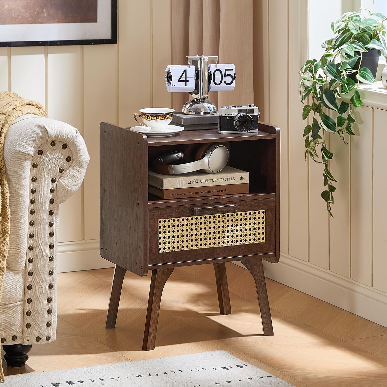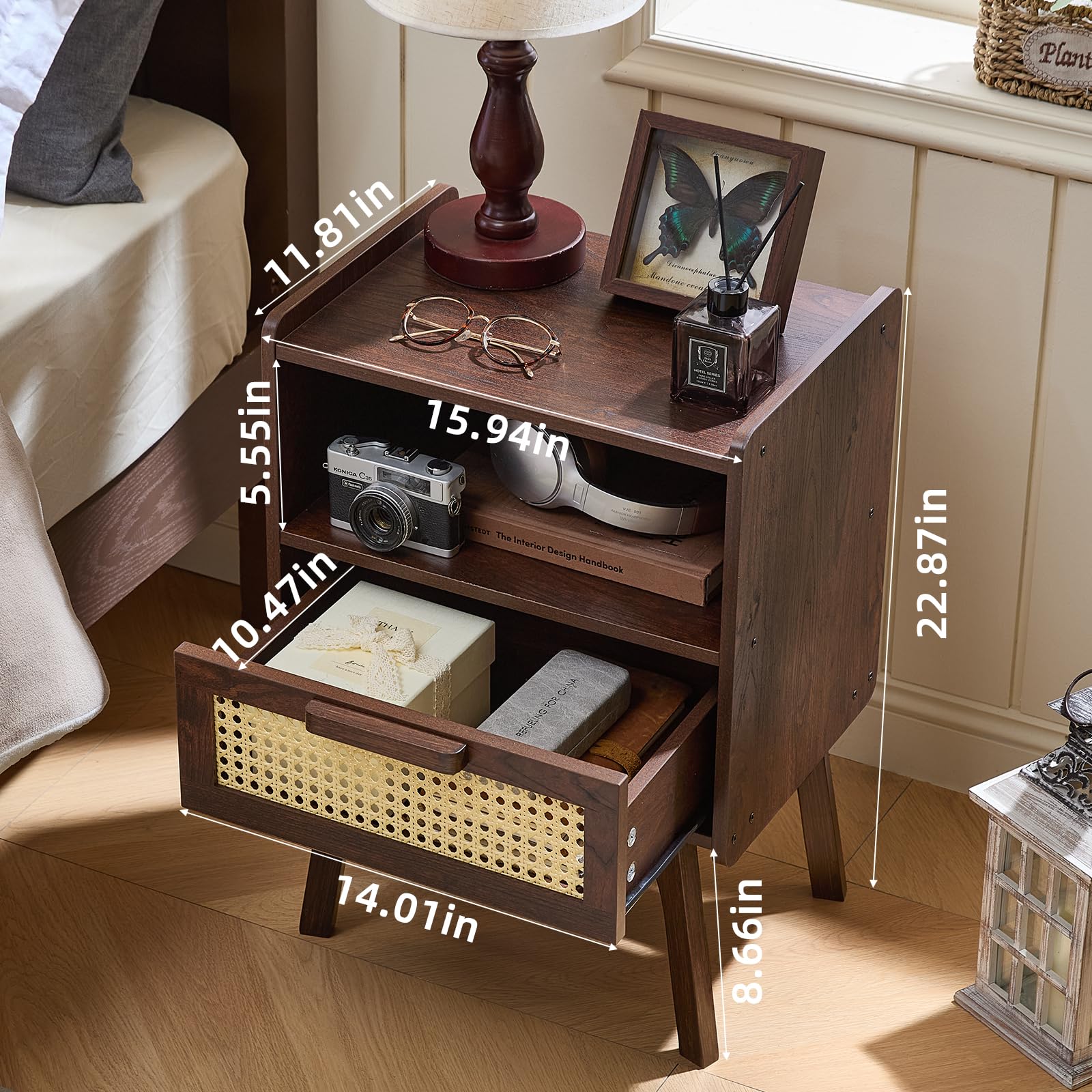 Anti-Drop Baffle & Anti-Knock Curved Edge: The baffle on both sides of the nightstand can prevent your items from falling, which can also give you a sense of security. You can place your cups, cell phones with confidence. The rounded design can also protect your family from injury. Special Drawer Design: The rattan design brings a charming boho style to your space, and the drawer provides you with more private storage space, this bedside table makes your space neater and more artistic. Thoughtful Handle Design: The notch design on the reverse side of the handle allows you to open and close the drawer easily, whether you have fingernails or not. Sturdy Beech Legs: Our four legs are made of valuable European beech for durability. The thickened beech legs and special internal screw reinforcement make the nightstand more stable, which also ensure the weight-bearing of the nightstand. The chic shape of the beech legs and the natural texture on them add beauty to the night stand. Basic Features: Color: Natural Wood Color Material: Sturdy Wood Boards+Beech Legs Overall dimension: 15.94"(L) x 11.81"(D) x 22.87"(H) Drawer dimension: 14.01"(L) x 10.47"(D) x 3.94"(H) Total Weight: 31.97 lbs Package Contents: 2 x Nightstand, 1 x Assembly Instruction, All installation tools. Notes: 1.Put the screws in loosely until all pieces are together and then tighten them all. It will save your time if you make a mistake when installing. 2.The nightstand is natural wood color and there will be some differences due to the display, light, and other reasons. Please refer to the actual product.