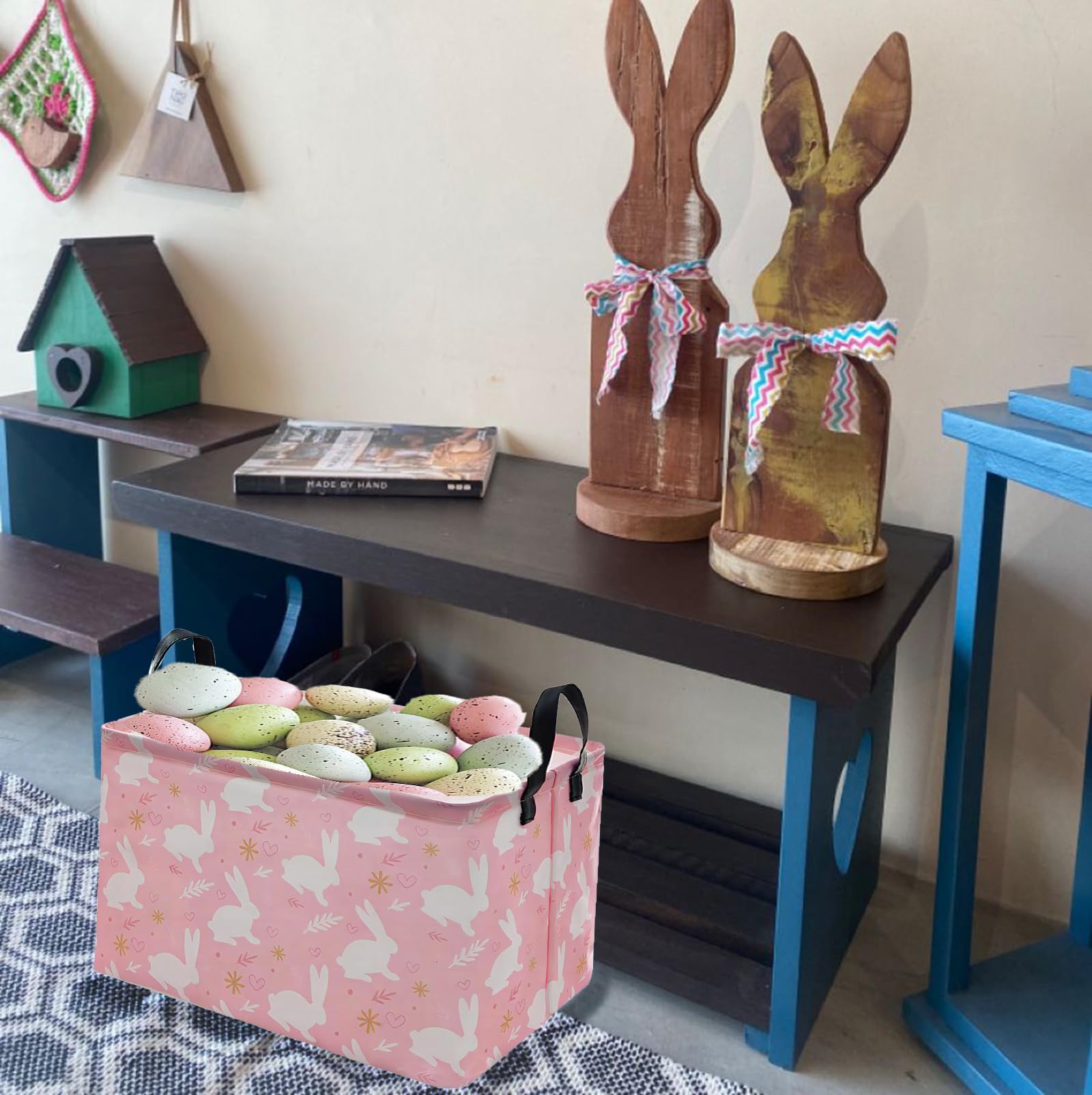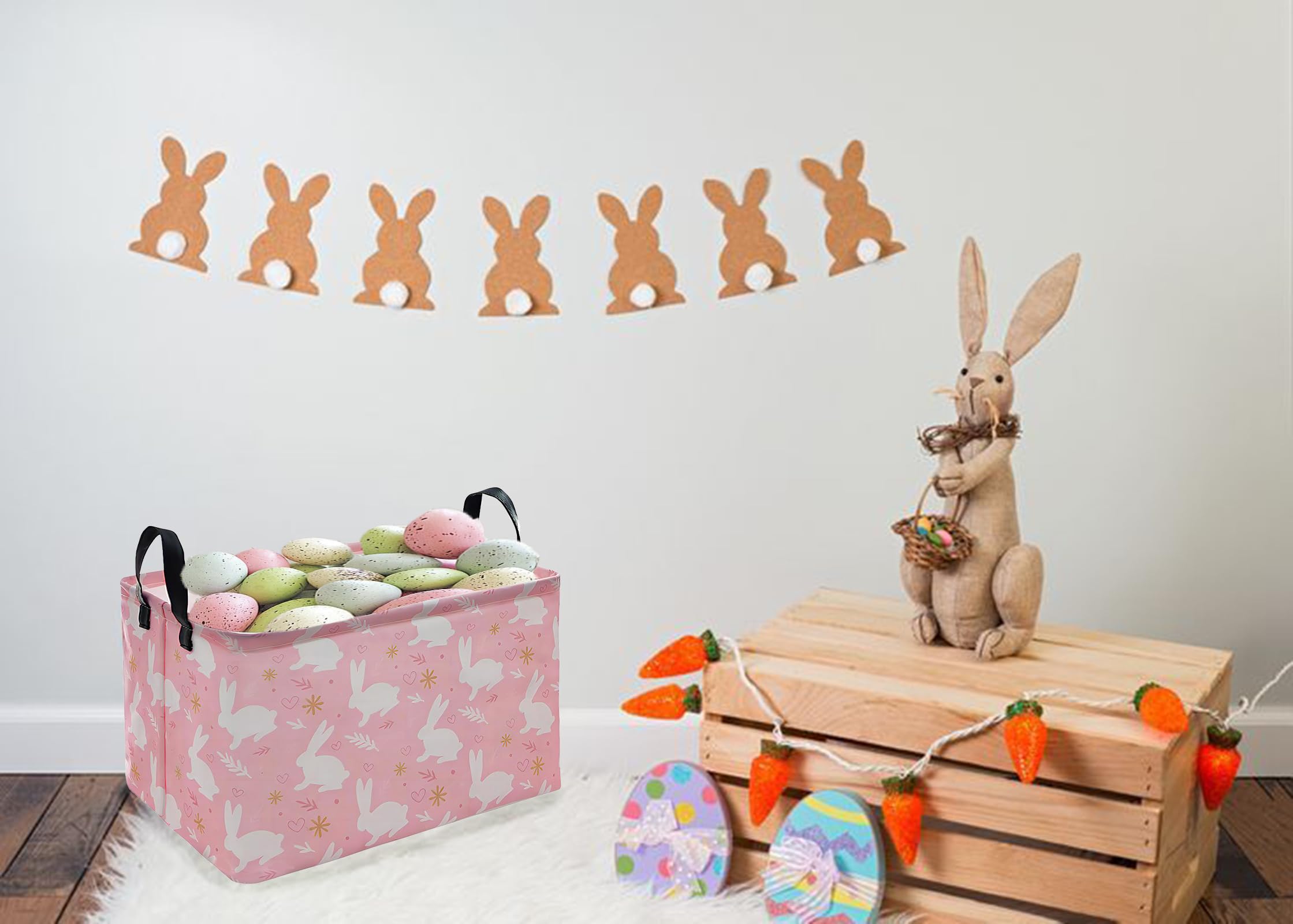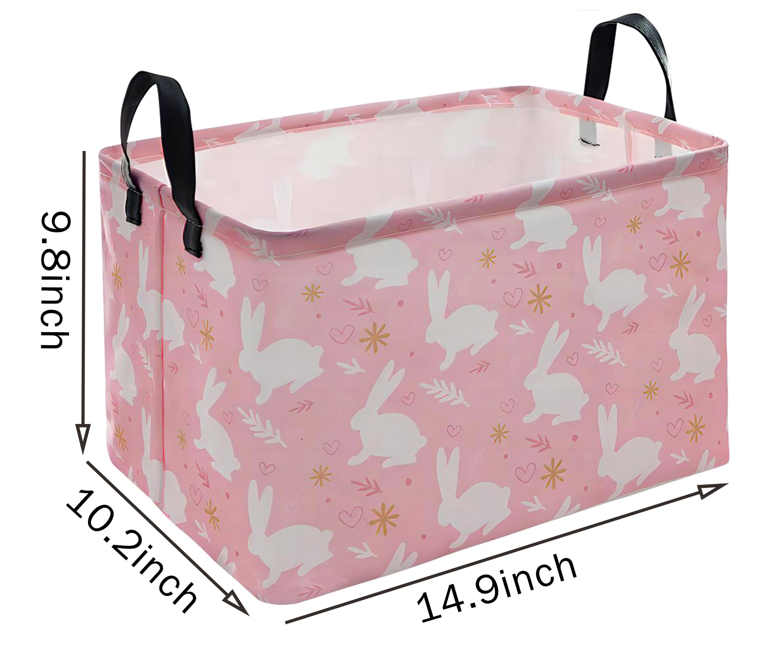 【Perfect Size】:The Easter egg basket is perfect size, measuring 14.9(L)×10.2(W)×9.8(H)inches. Our Bunny Easter Basket provides ample space for a bounty of Easter eggs. 【Multifunctional Use】: This Easter bucket can be used beyond being an ideal Easter egg storage, suitable to store dirty clothes washing, place in the children's room to store toys, books and other household goods, keep the house clean and tidy. Perfect for hamper in a nursery, home, office, closet organizer, bedroom, bathroom, college dorm, etc. 【Premium Material】: Crafted from high-quality cotton material. leather handle + waterproof PE coating lining 【Lightweight Collapsible】:Lightweight for your kids to take with them on their easter egg hunts! portable to carry on. Folds up easily for storage. 【NOTE】: If you want it to be as perfect as the picture, you can use an iron or hanging ironing machine to eliminate creases