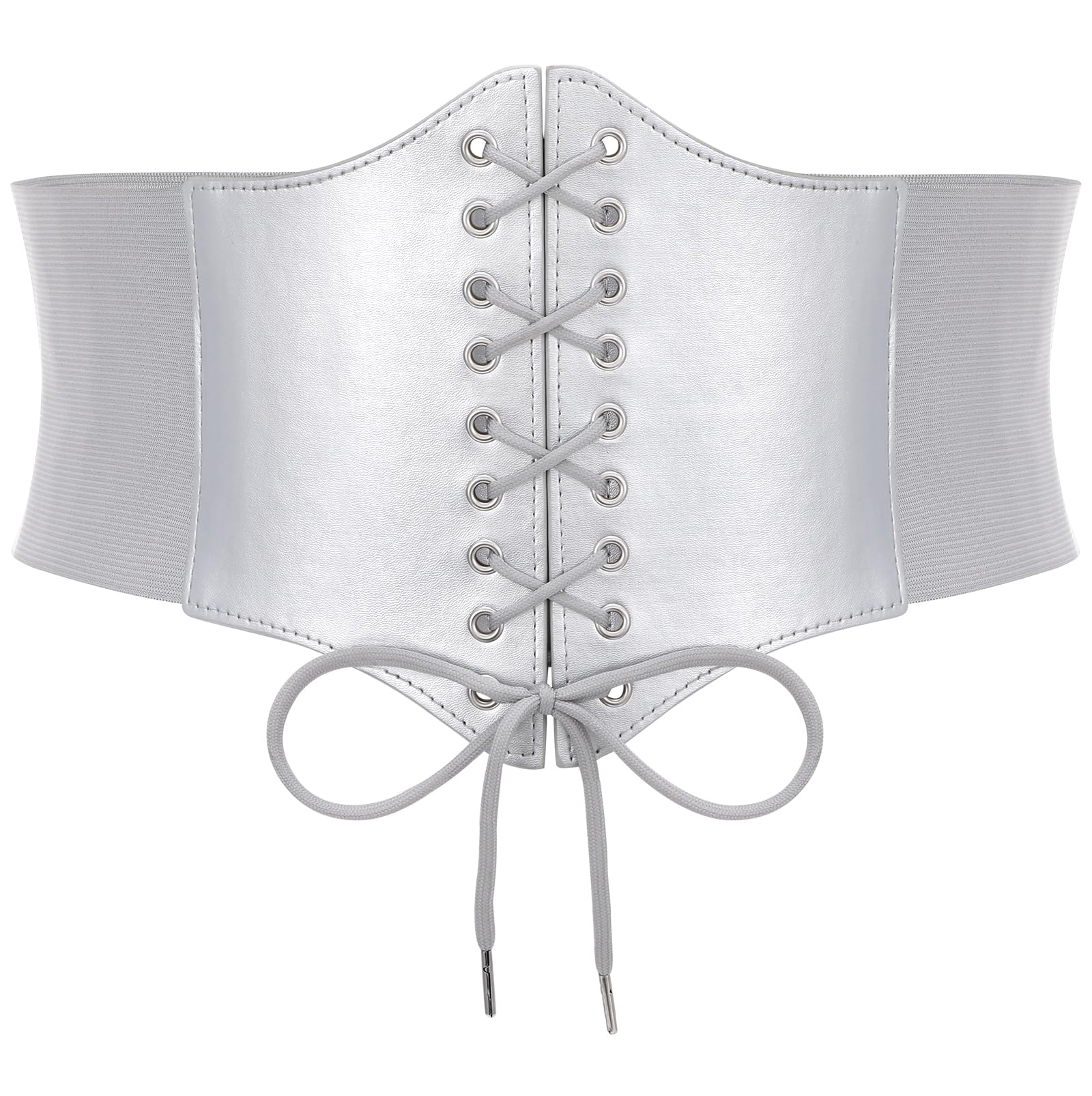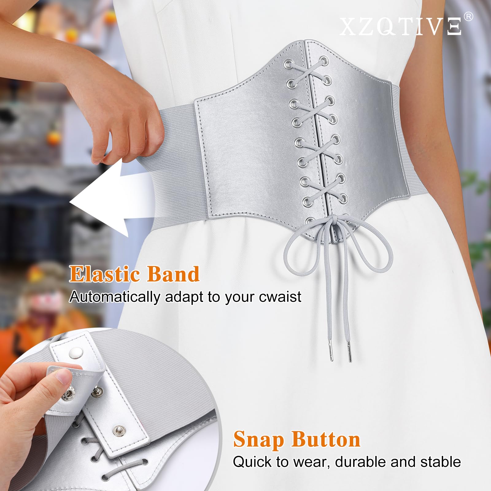 ➜ Black Corset Belt for Waist - Wide Costume cinching belt with tied corset leather on the front, elastic webbing band on the back, snap button closure to lock the belt,
