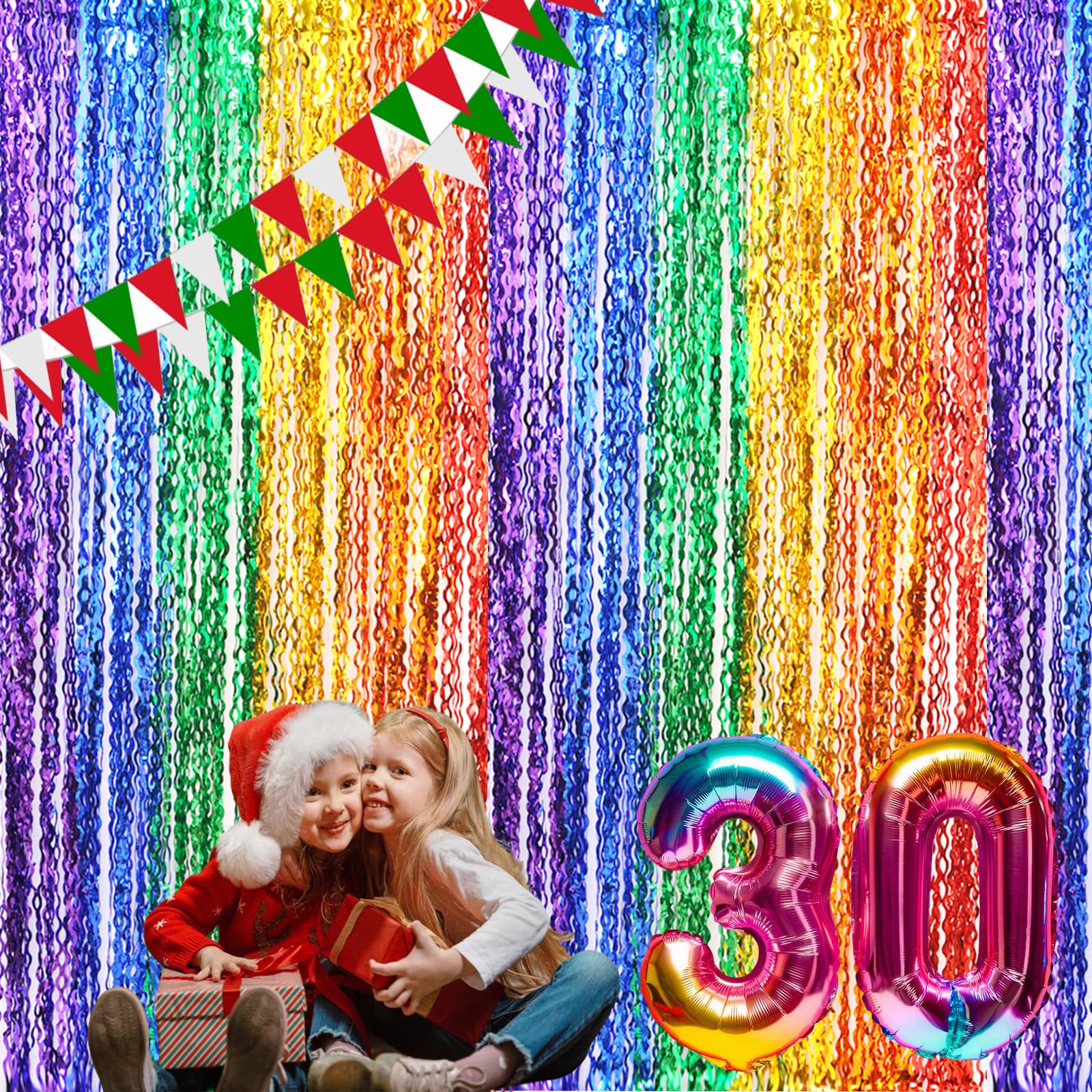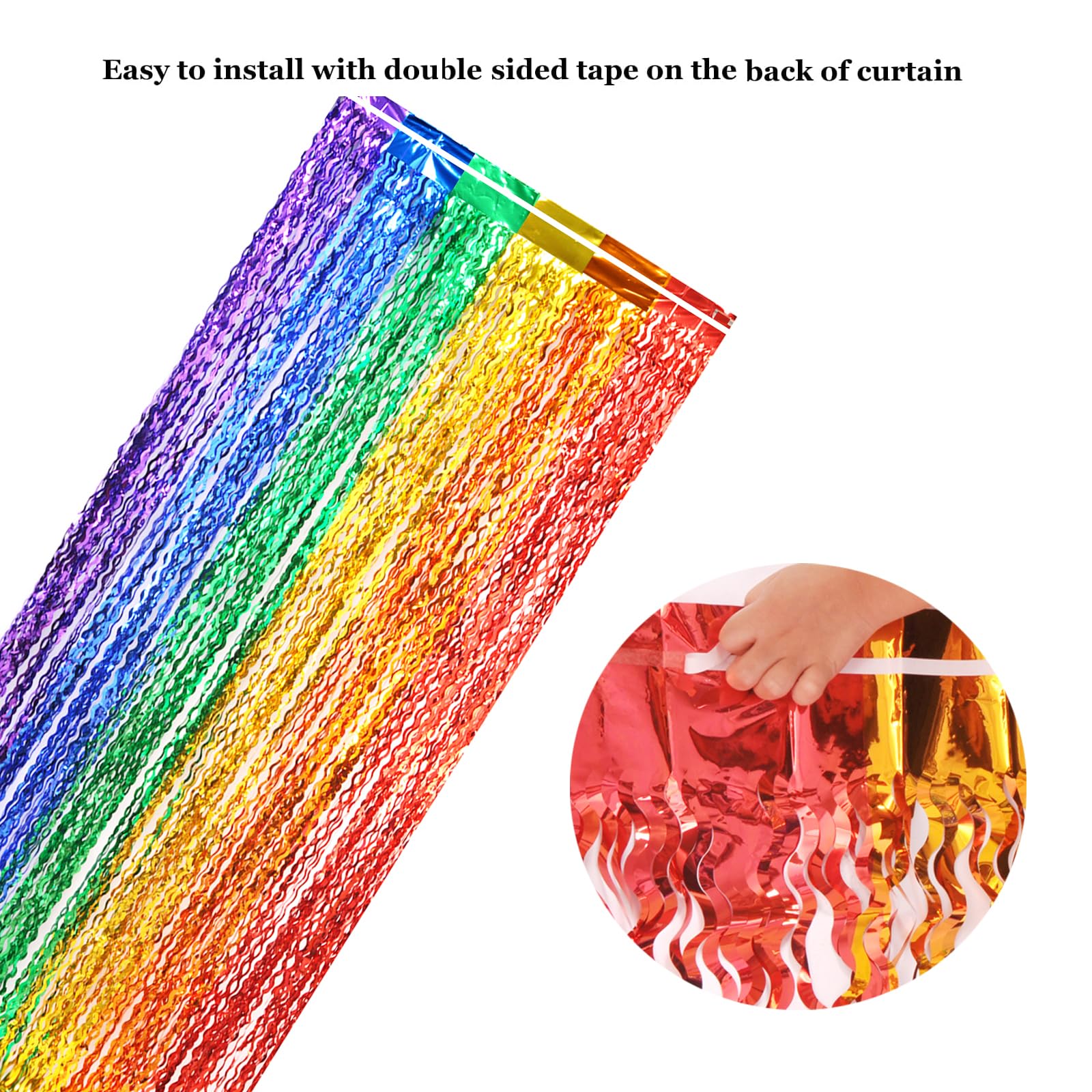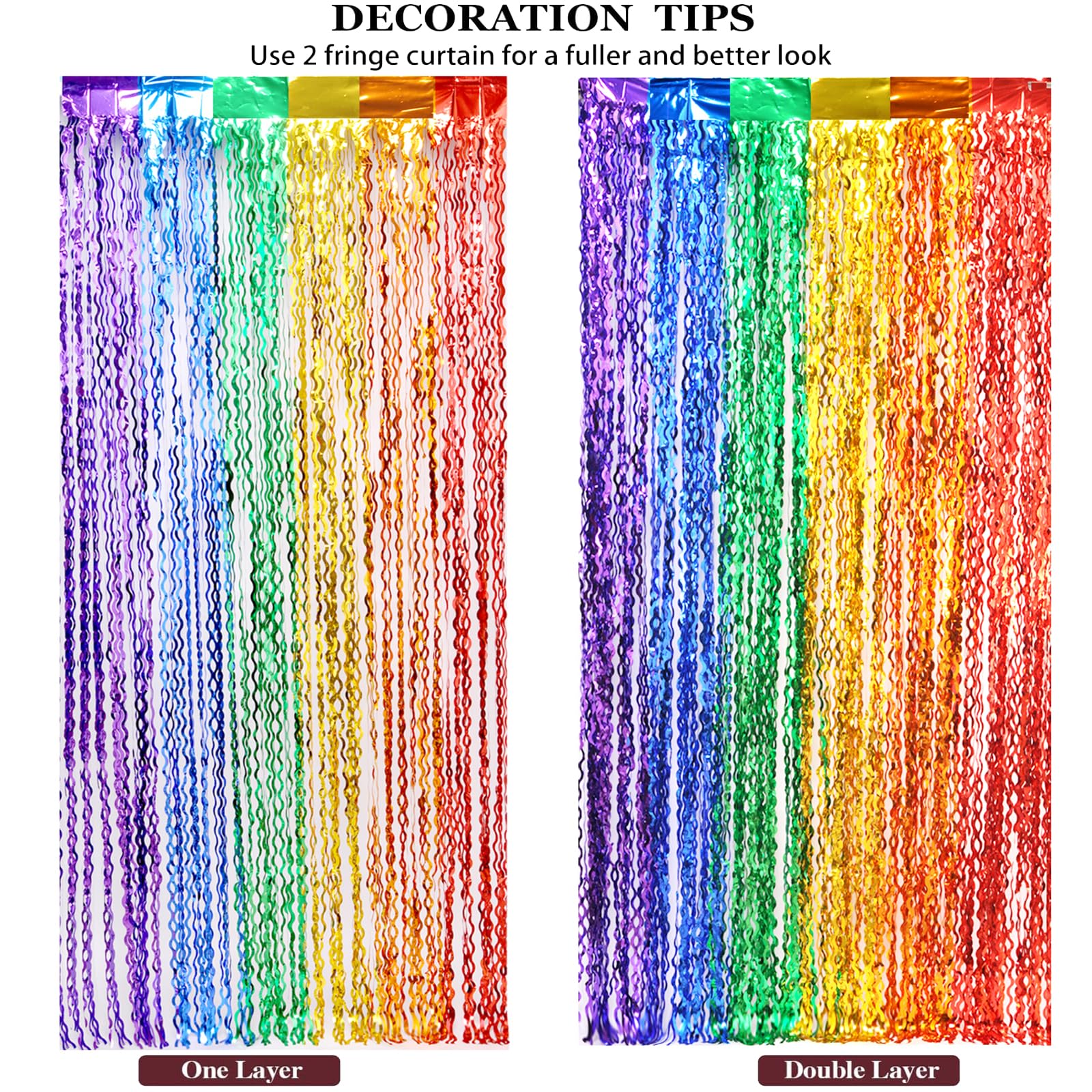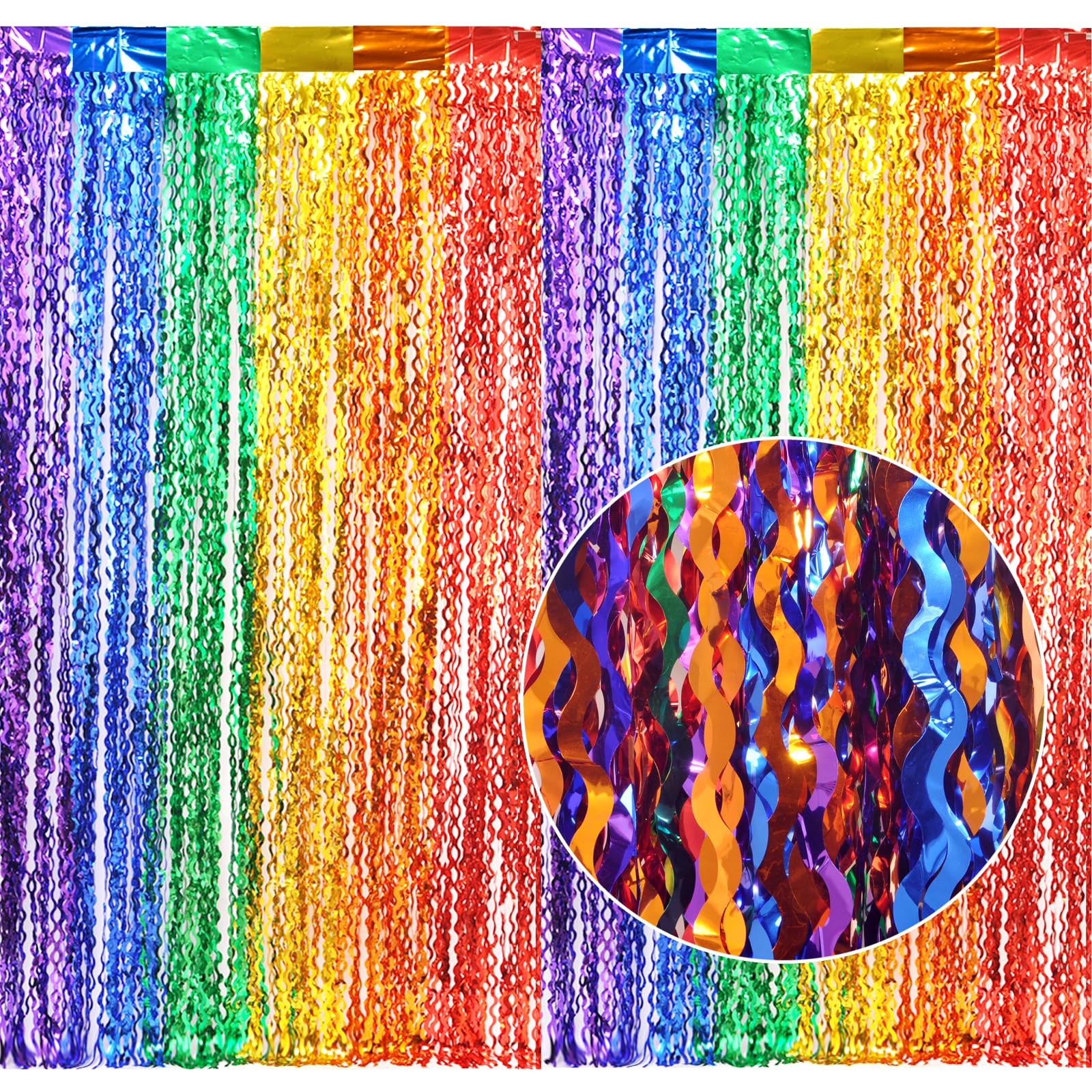 LATEST Shiny Surface and Wavy Shape Tinsel Backdrop:The colorful foil curtain backdrop each pack with 6 color purple blue green gold orange red connected, made of aluminium foil wavy shape, good for adding sparkle as decorations for parties