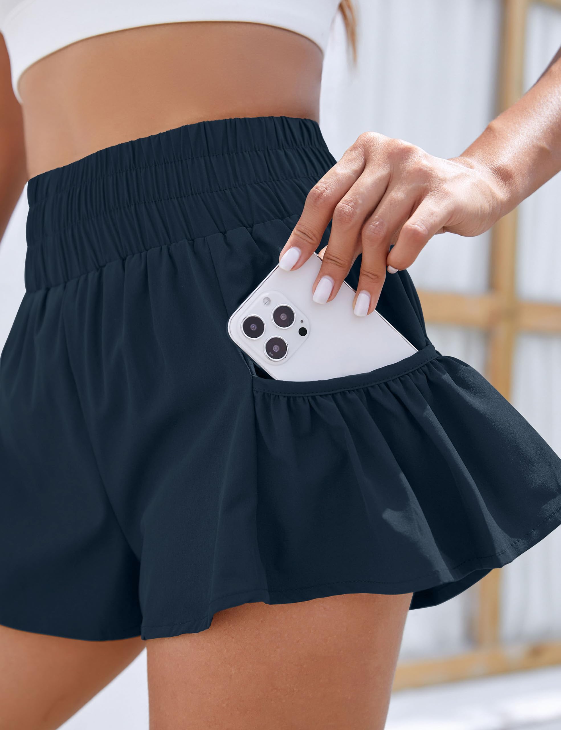 【Design】This gym shorts is featured with Super High Waist, Cute Side Pockets, Loose Fit, Lightweight and Quick Dry Fabric