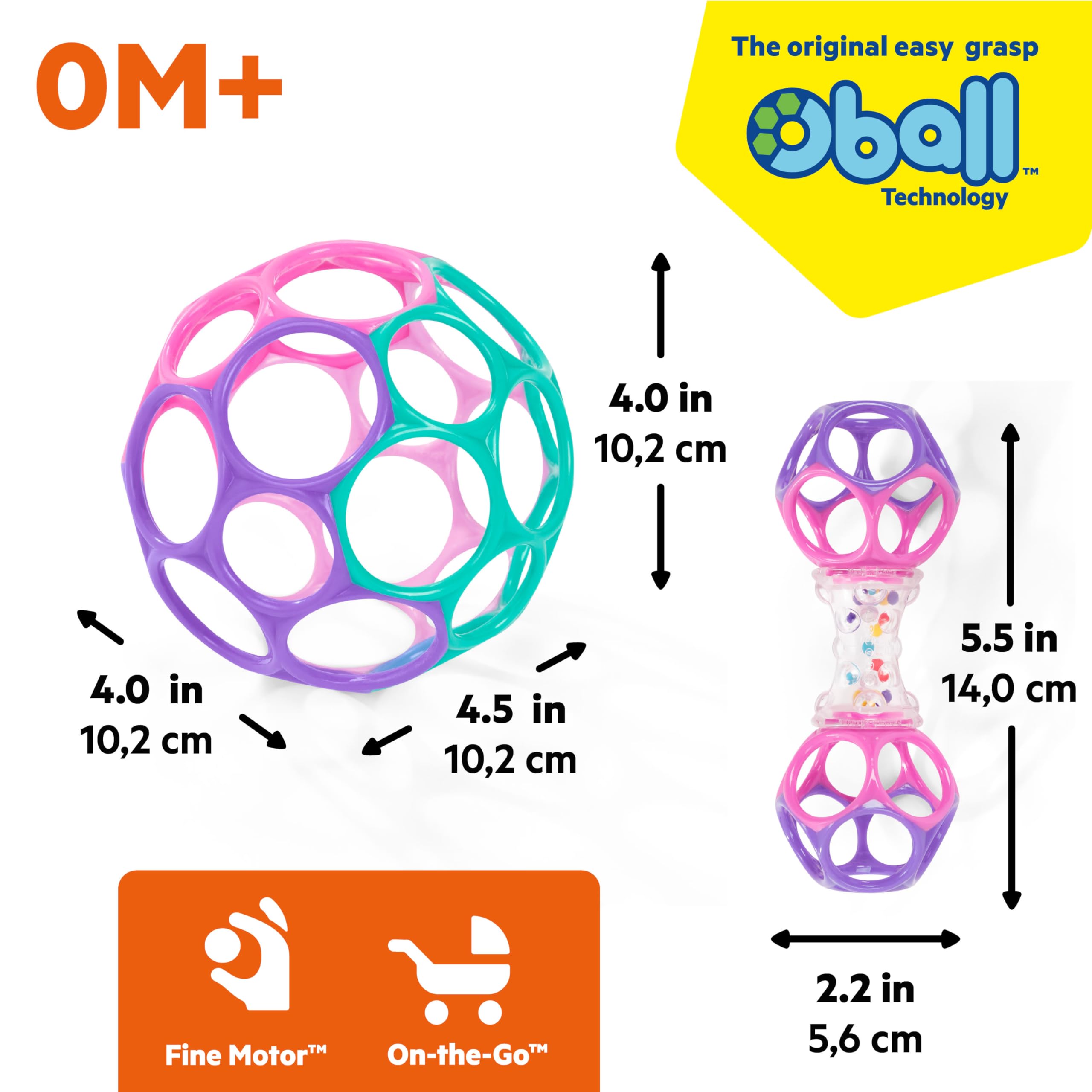 Take the guesswork out of gifting with the pretty-in-pink Delightful Duo gift set from Bright Starts! Combining the joy of two beloved Oball baby toys, this easy-to-pack and easy-to-grasp duo includes the Oball Shaker and Oball Classic in an adorable pink and purple fashion. These toys are family favorites for a reason! The shaker introduces cause & effect play with a clear, textured handle and brightly colored rattle beads that babies love to hear and watch. On each end, the baby rattle is made of flexible and durable Oball material, complete with grip details and lots of finger holes suitable for their small hands. The Oball Classic is a bestselling ball loved by parents, developmental experts, and of course, babies! The toy provides so many play opportunities, from gripping to catching to throwing with ease. Made with the iconic Oball finger holes, this ball toy encourages the development of fine motor skills. Both toys are easy to clean. Simply wipe clean with a damp cloth and mild soap. They’re also perfect for on the go. Pack along for fun everywhere – both toys easily fit in a diaper bag. Both toys are designed for ages newborn and up. It’s the ultimate gifting bundle for welcome home baby gifts, baby shower gift ideas, and just-because-I-love-yous!