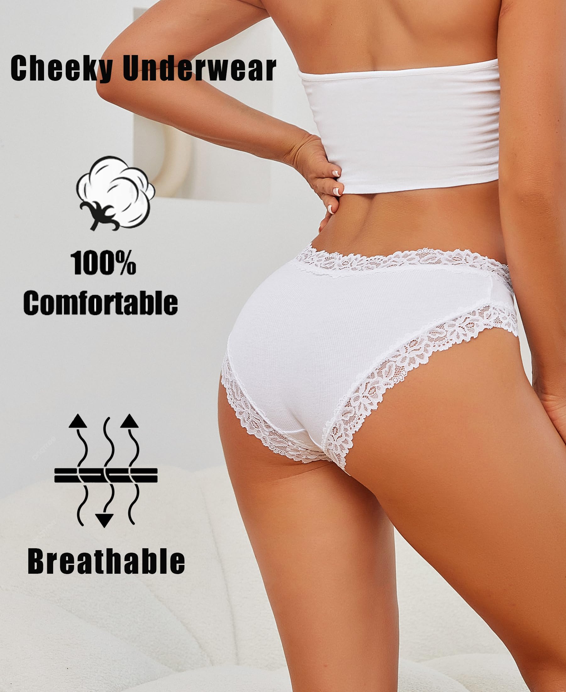 Cotton Underwear for Women : The panties made by 95% PREMIUM COTTON, 5% spandex. Crotch inner lining: 100% cotton. Comfortable and breathable fabric skin-friendly; Super cute Lace waist, great for girl and mommy, 6 pack lovely set of colors, great for everyday wear.