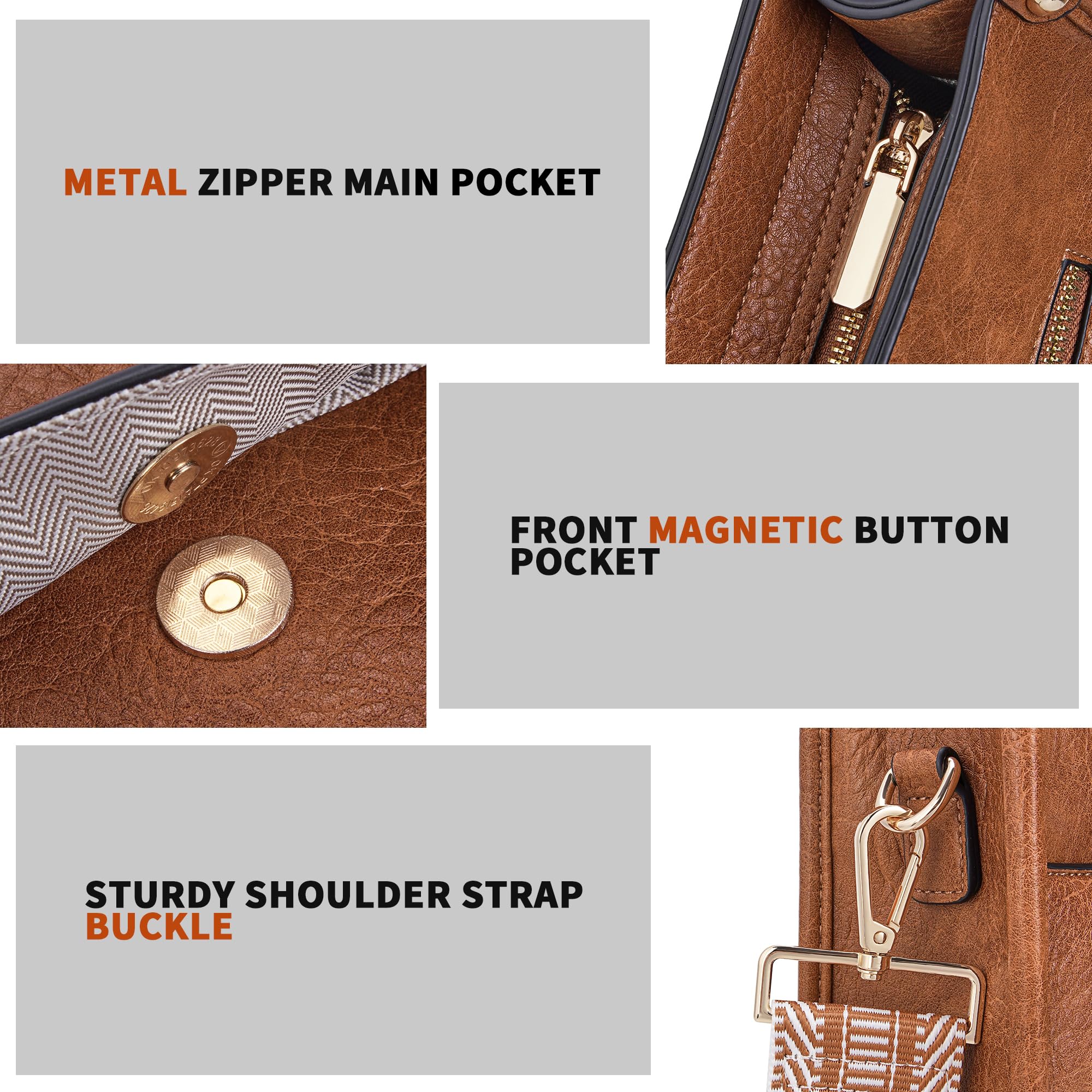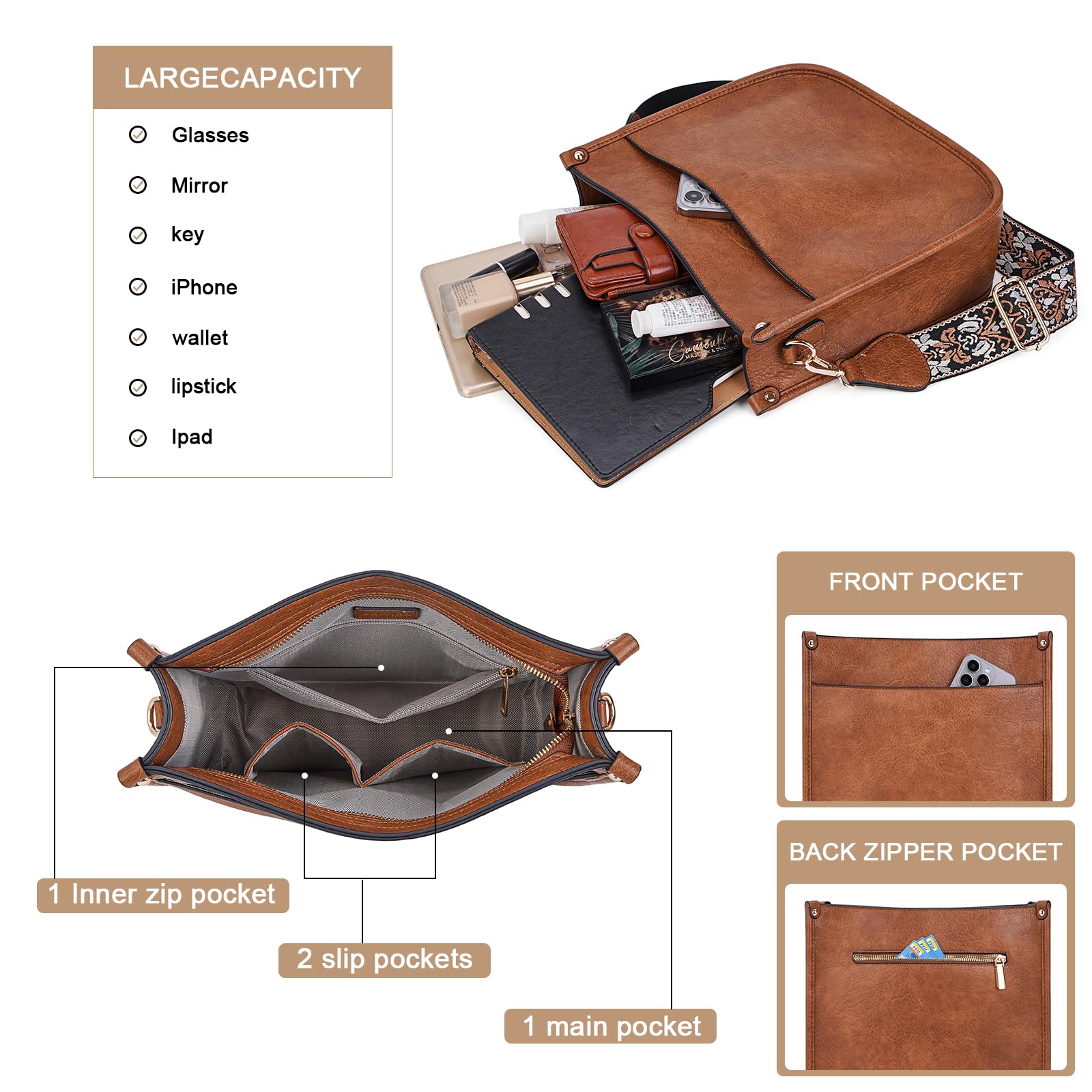 Crossbody Bag Structure:Internal structure is one main compartment including 1 main pocket,1 inner zipper pocket,2 slip pockets-cell phone pocket and ID card slot.External structure including 1 metal magnetic buckle pocket and 1 back anti-theft pockets,come with metal zipper closure,main pocket and back pocket antitheft zipper design-double antitheft to protect your property safety