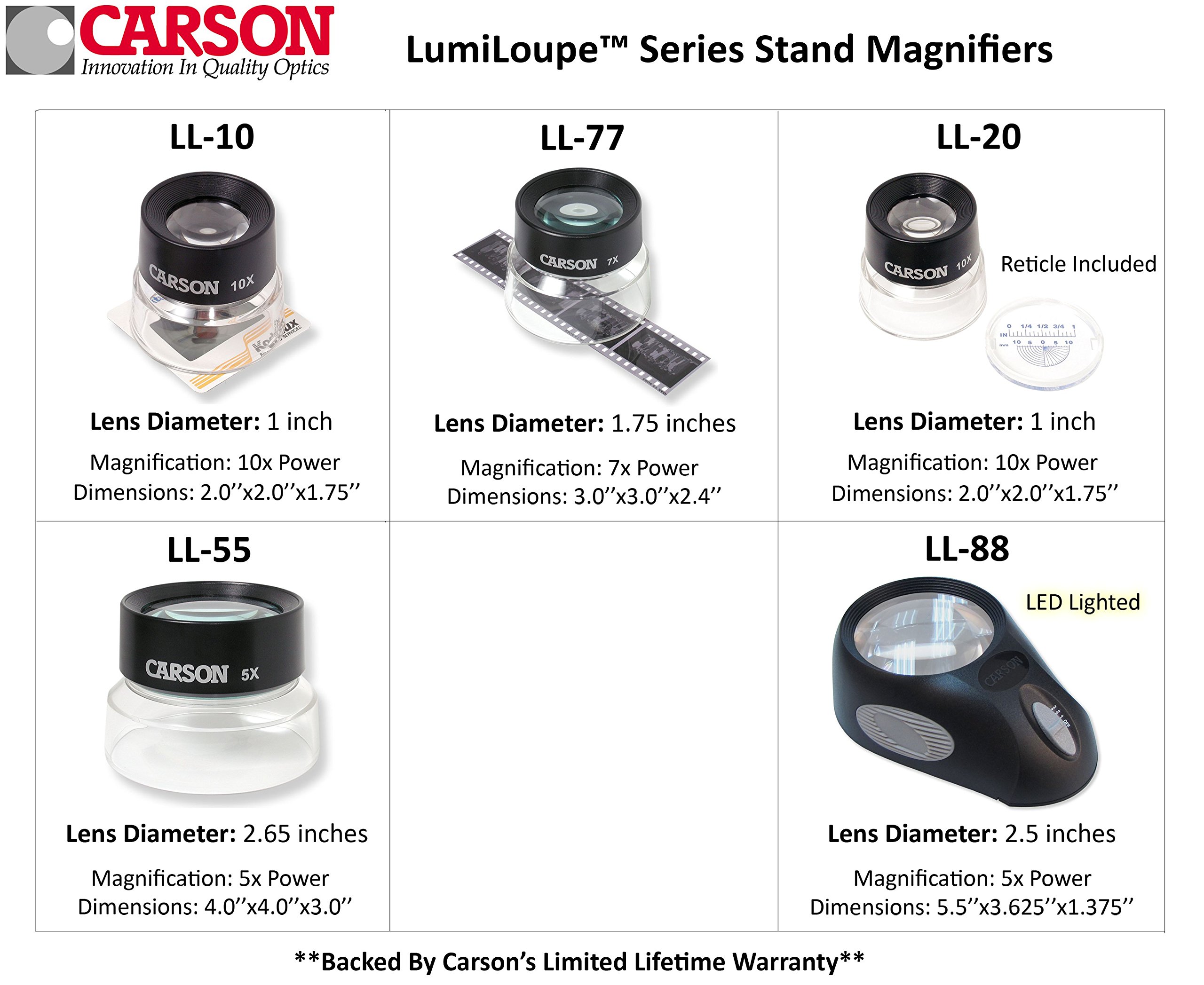 The LumiLoupe 10x Magnifier from Carson Optical is ideal for close-up examination of objects. Its transparent acrylic base allows ambient light to illuminate the subject for bright, clear viewing. The snap-on reticle lets you make accurate measurements in both millimeters and inches.