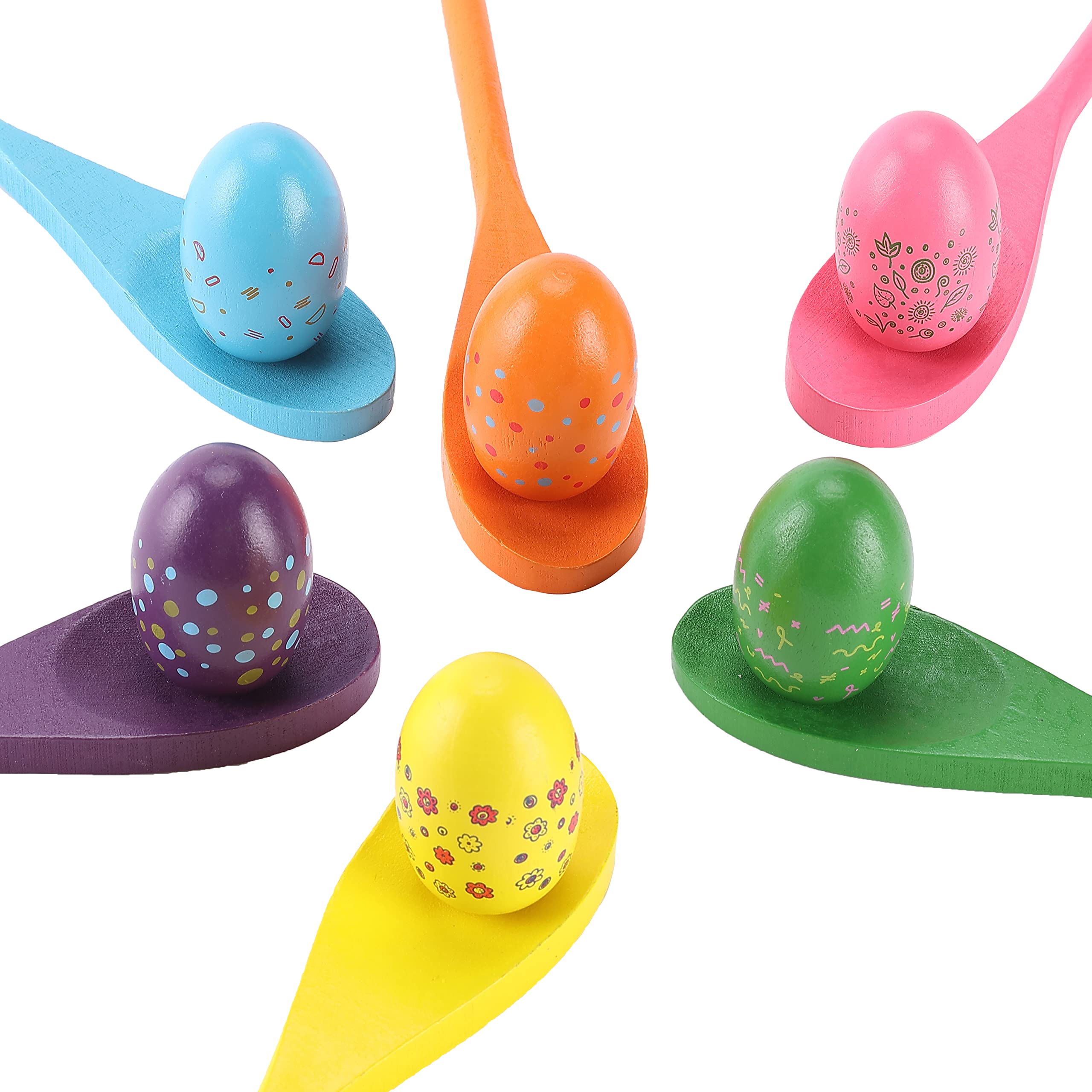 Package includes 6 colorful spoons and 6 eggs. Colors come in orange, yellow, green, blue, purple, and pink for 6 players. You will have a great time with happiness and laughter throughout the game.