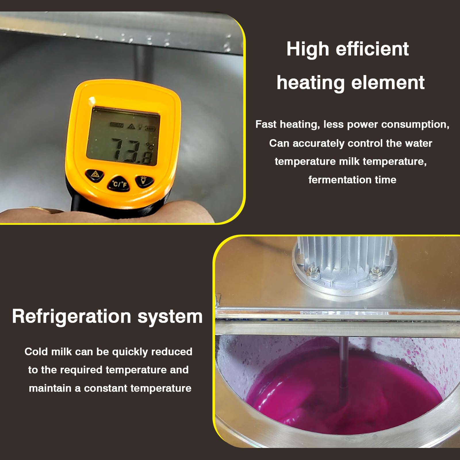 Auto heating, auto cooling, auto washing. High efficient heating element, fast heating, low power consumption. Auto cooling funtion. After pasteurization, the machine will cool down the liquid according to the temperatuer you set. Pasteurize temperature: 60°C~85°C(140℉~185℉). Cooling temperature: 3°C-15°C(37.4℉~59℉).
