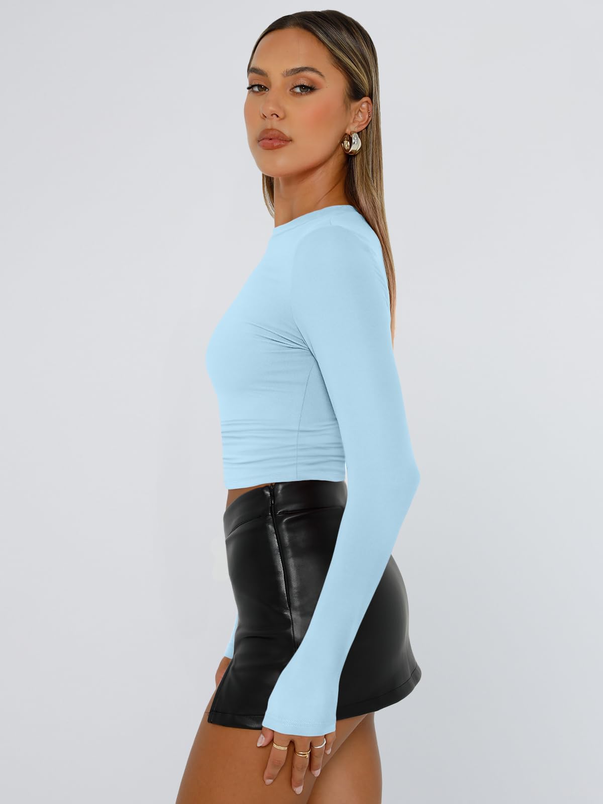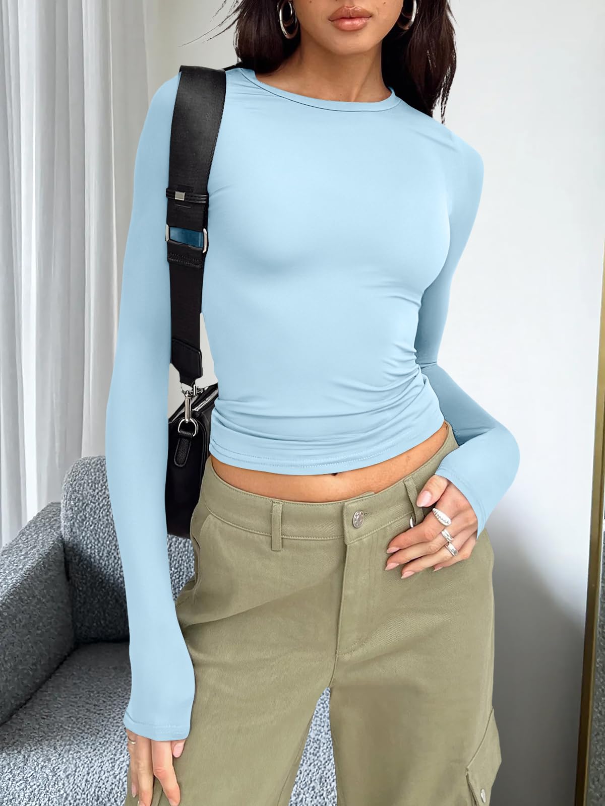Design: Cropped and stretch fitted style,crew neck, tight underscrubs layer,you can wear it regularly or fold it up like a crop top,cute,slim fit,casual y2k style fashion