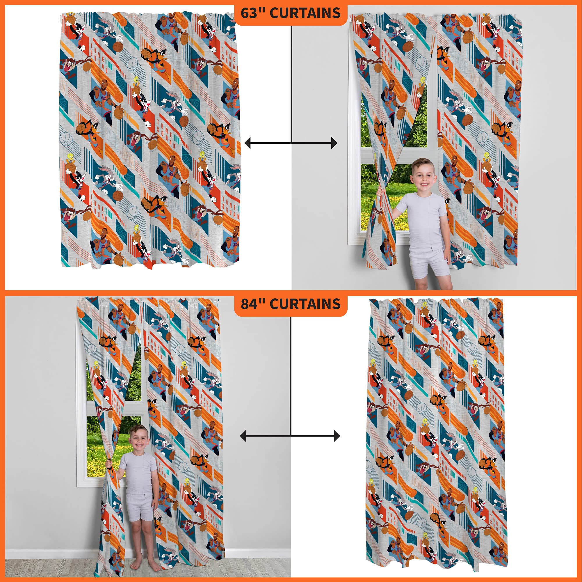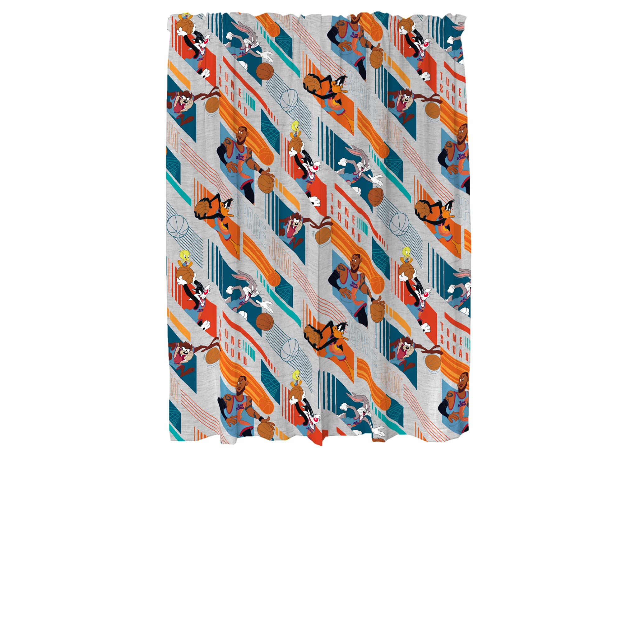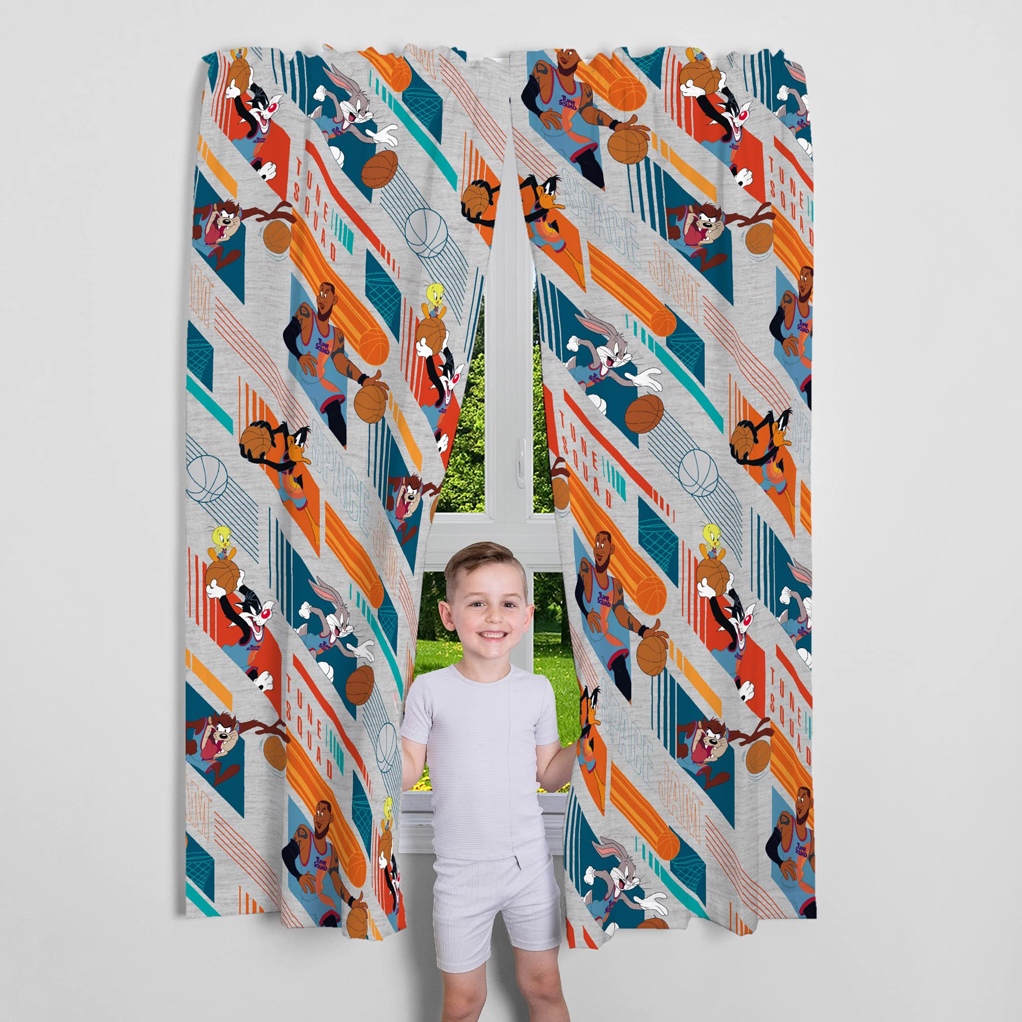 SPACE JAM 2 A NEW LEGACY DESIGN: Add some slam-dunk style to your child’s world with these colorful Space Jam 2 drapes. Featuring LeBron James, Tweety, Bugs Bunny, Daffy Duck, Taz and Sylvester from the popular WB animated sequel, these drapes pop with a sporty "Basket Hanging" pattern.