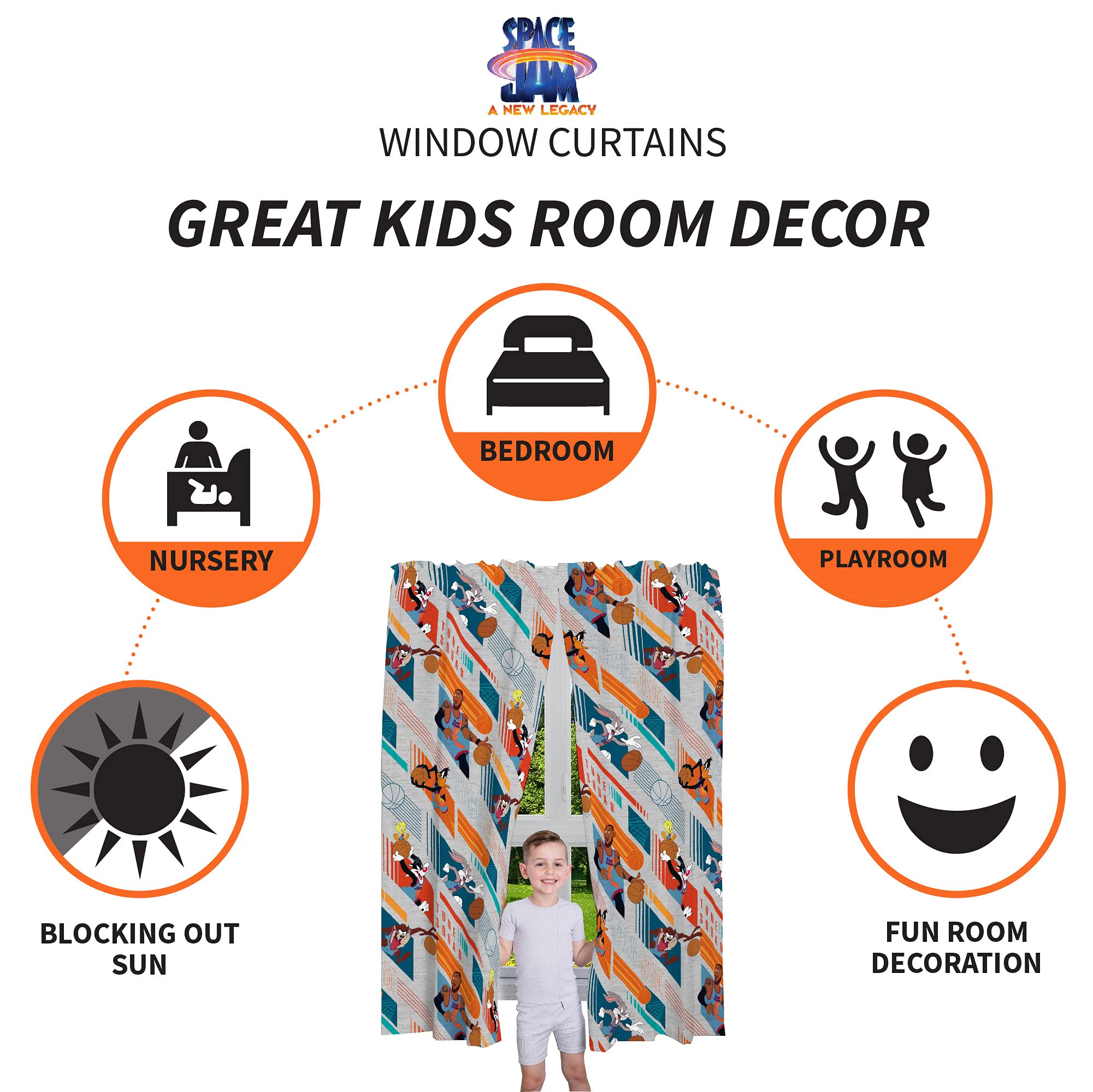 FUN ROOM DECORATION: A cool and colorful choice to brighten up a child’s bedroom, nursery or playroom, these kids’ curtains feature action-packed Space Jam 2 imagery your little Looney Tunes fan will love. The vibrant blue, orange and grey drapes add privacy and sporty style to the room of any young basketball fan.