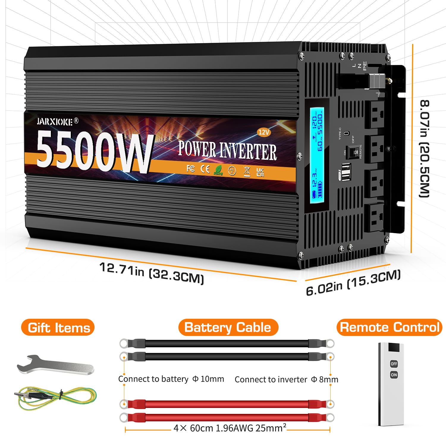 ☀ What you will get: JARXIOKE 5500W 12V Power Inverter, Battery Cable, Remote Control and User Manual. We offer a 24-month warranty on every order. If you have any questions, please contact us by email!
