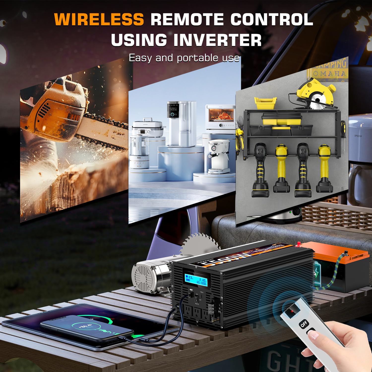 ☀ This is a 12 volt 5500 watt modified wave inverter that converts DC 12v to AC 110V/120V. Perfect for traveling, camping, tents, boat trips, working on the road, and anywhere without electricity! Just connect the power inverter to the battery and then to the device.