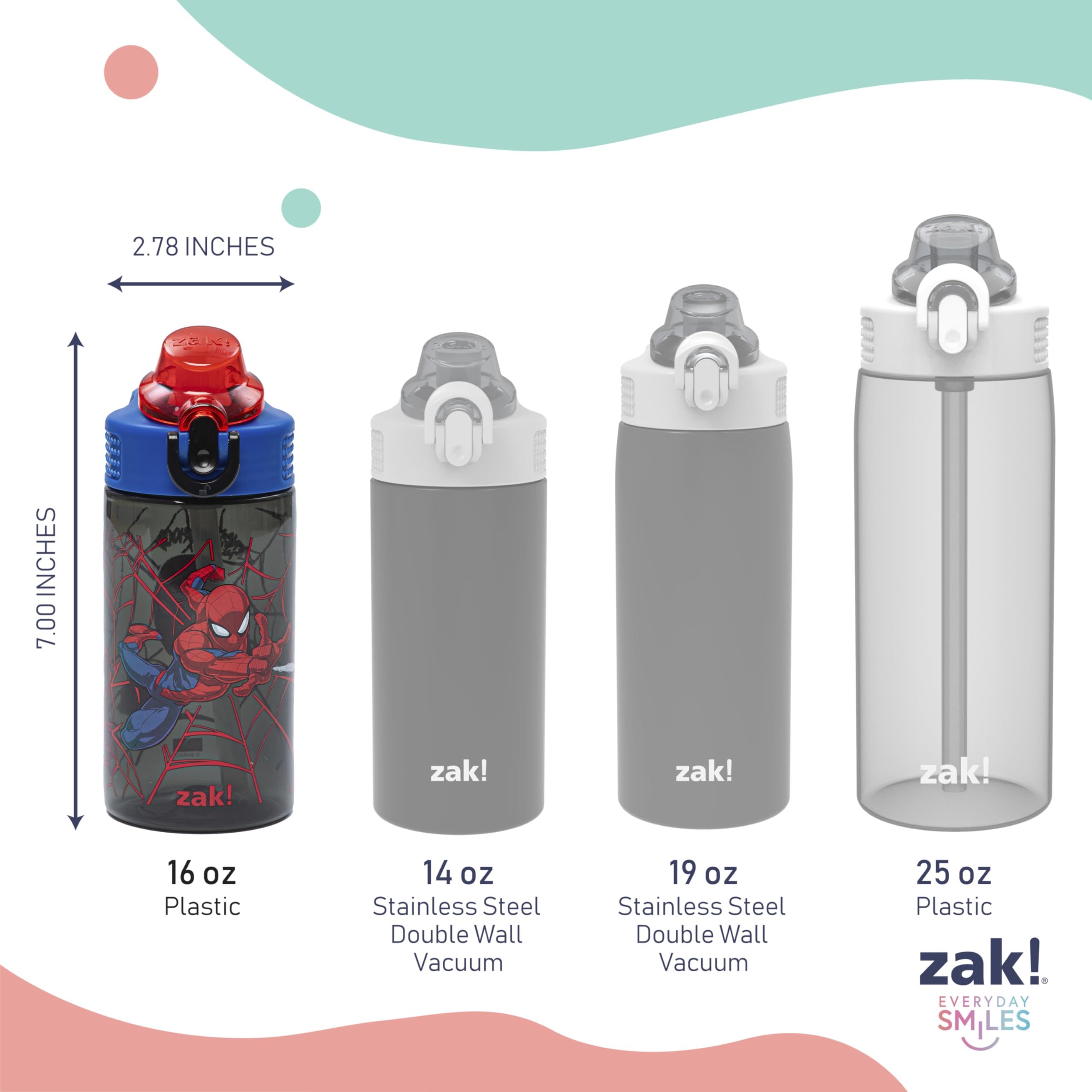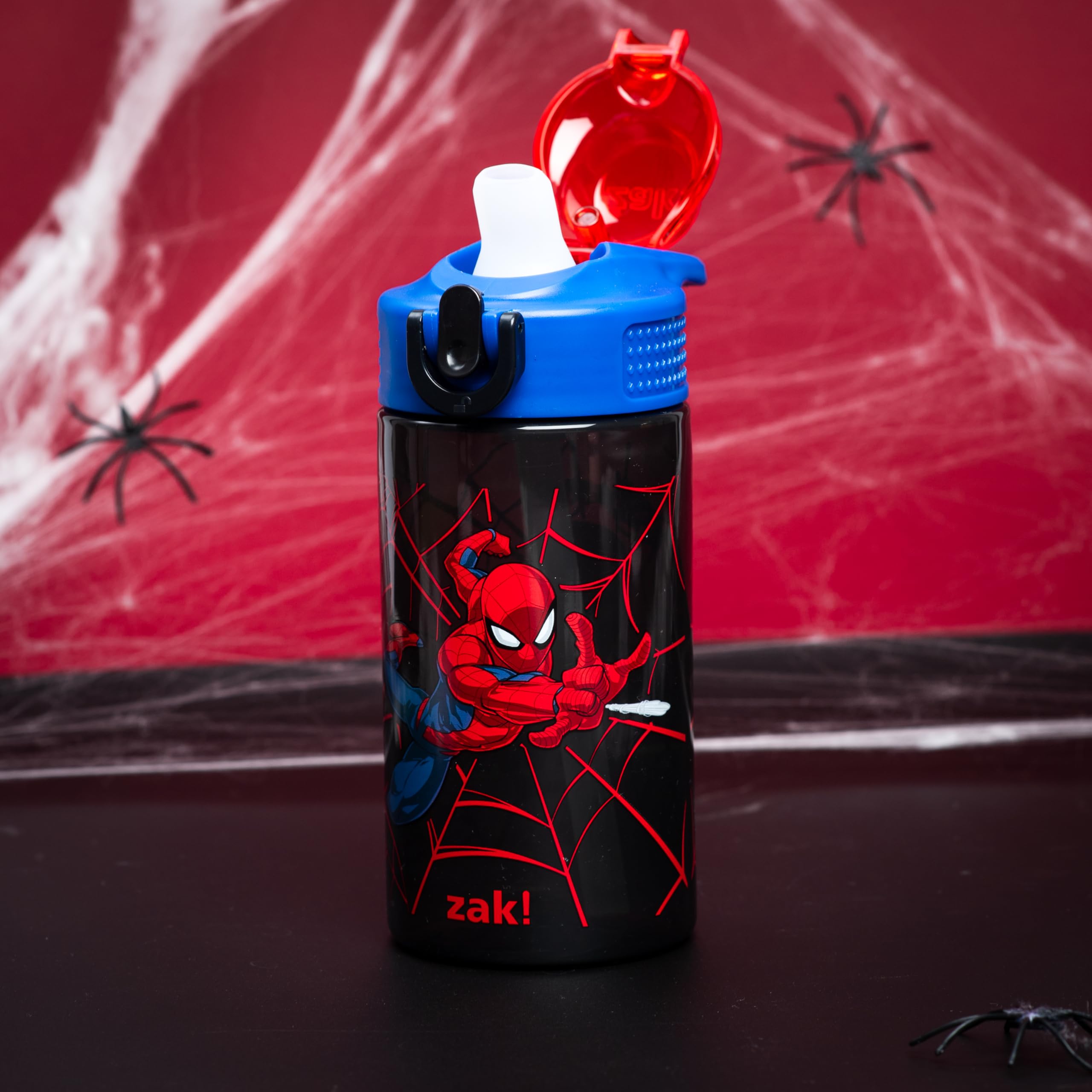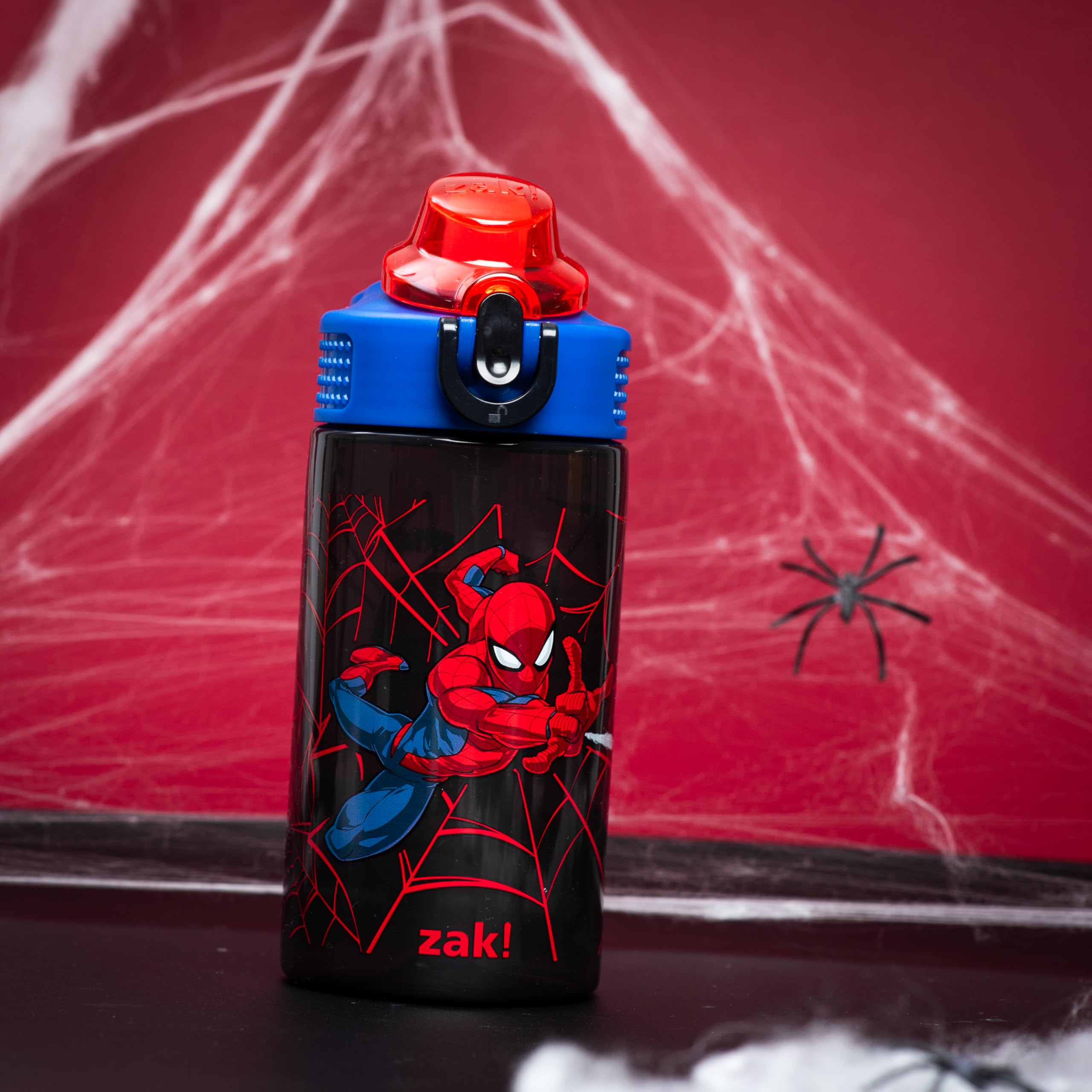 Let kids enjoy hydration with a fun Marvel water bottle by zak! designs! Easy to Clean: The silicone spout and straw can be removed from the lid, and the pieces are dishwasher safe for simple cleanup at the end of the day. Reusable and Durable Material: Reusable water bottles will last wash after wash—good news for you and the environment! The 16 oz water bottle is made of PP plastic, durable enough for kids to use every day and bring on any adventure. Leak-Proof Lid: The lid screws on securely and won't leak when the spout is closed, though water flows for easy drinking when the spout is open. The easy-open button has a flip-up lock to keep it from activating accidentally. On the Go: The water bottle has a built-in carrying loop on the lid for easy transportation, and with the spout cover to keep the spout clean and closed, it can be tossed into a bag for worry-free travel. Specifications: 16 oz capacity. Made of durable plastic. Dishwasher safe, do not microwave. Length: 4.33-inch, Width: 2.78-inch, Height: 7-inch. Character: Marvel Spider-Man.
