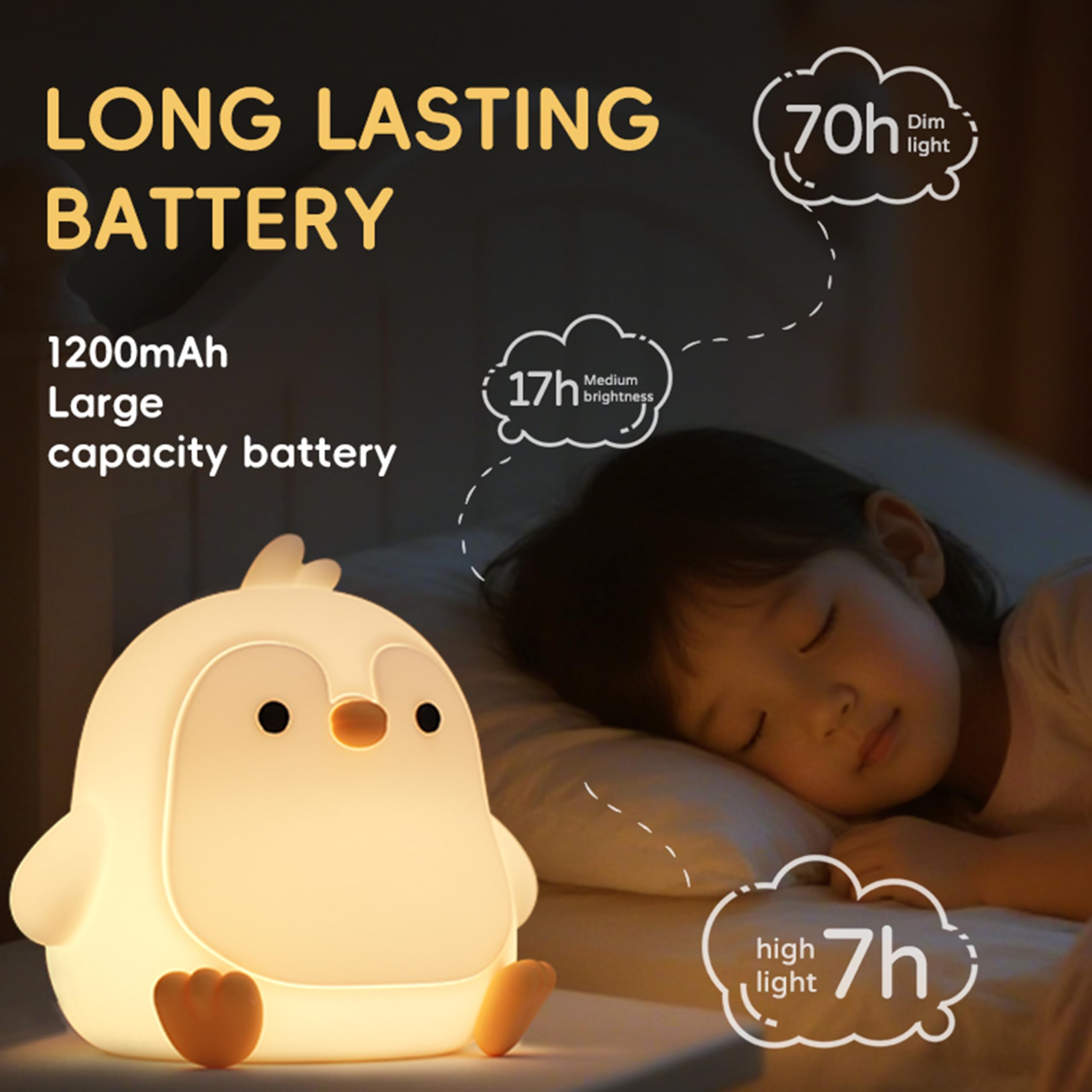 【USB Rechargeable & Portable】This LED squishy penguin night light has a built-in 1200 mAh battery with long battery life, it is a companion for nursery rechargeable LED bedside lamp and sleep light. Designed in handheld size, you can carry the night light with them when traveling. This cute and practical lamp is a must-have for all ages.