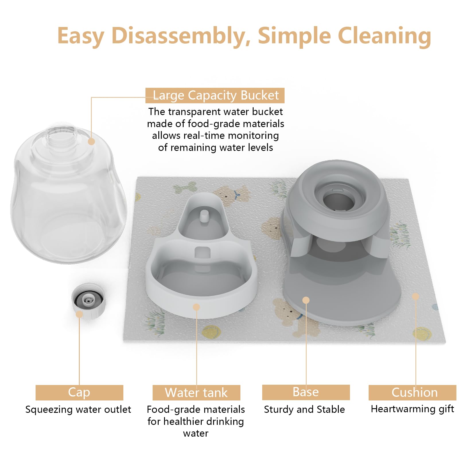 【Easy to Use and Clean】Dog water dispenser features a transparent design, ensuring you can easily monitor the water level and refill it promptly when it's running low. The modular design makes it easy to disassemble the various components of this automatic water dispenser, allowing for thorough and hassle-free cleaning. The smooth surface of the water bowl prevents stains from sticking, and it can be removed separately for convenient cleaning.