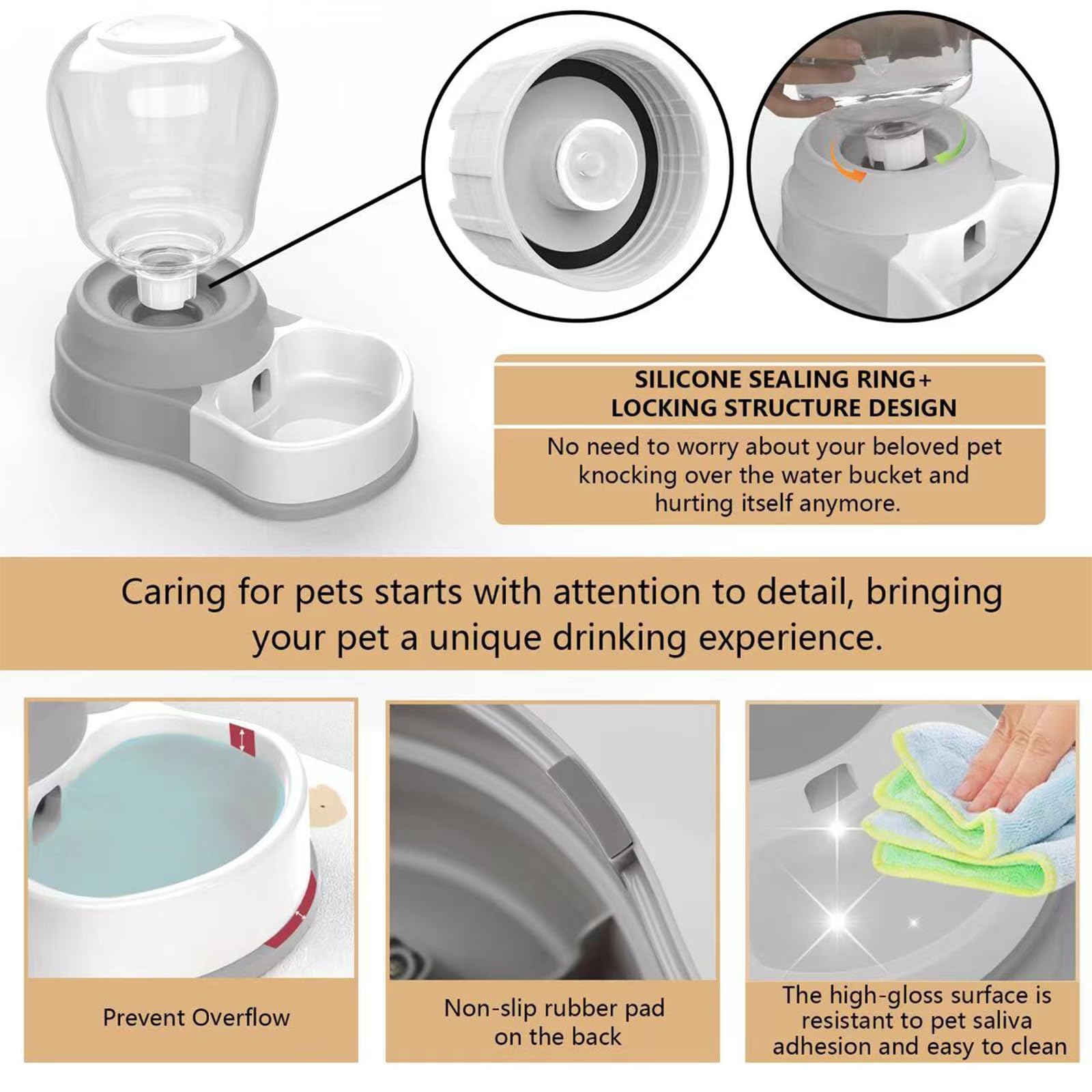 【No leakage】The base of the cat water dispenser features a double-tiered step design, providing enhanced water spill prevention. The base is sufficiently wide and equipped with anti-slip features to prevent pets from tipping over the water while drinking. The water bottle cap includes a sealing O-ring, and there is a locking mechanism between the water bottle and the base, ensuring a tight and secure fit.