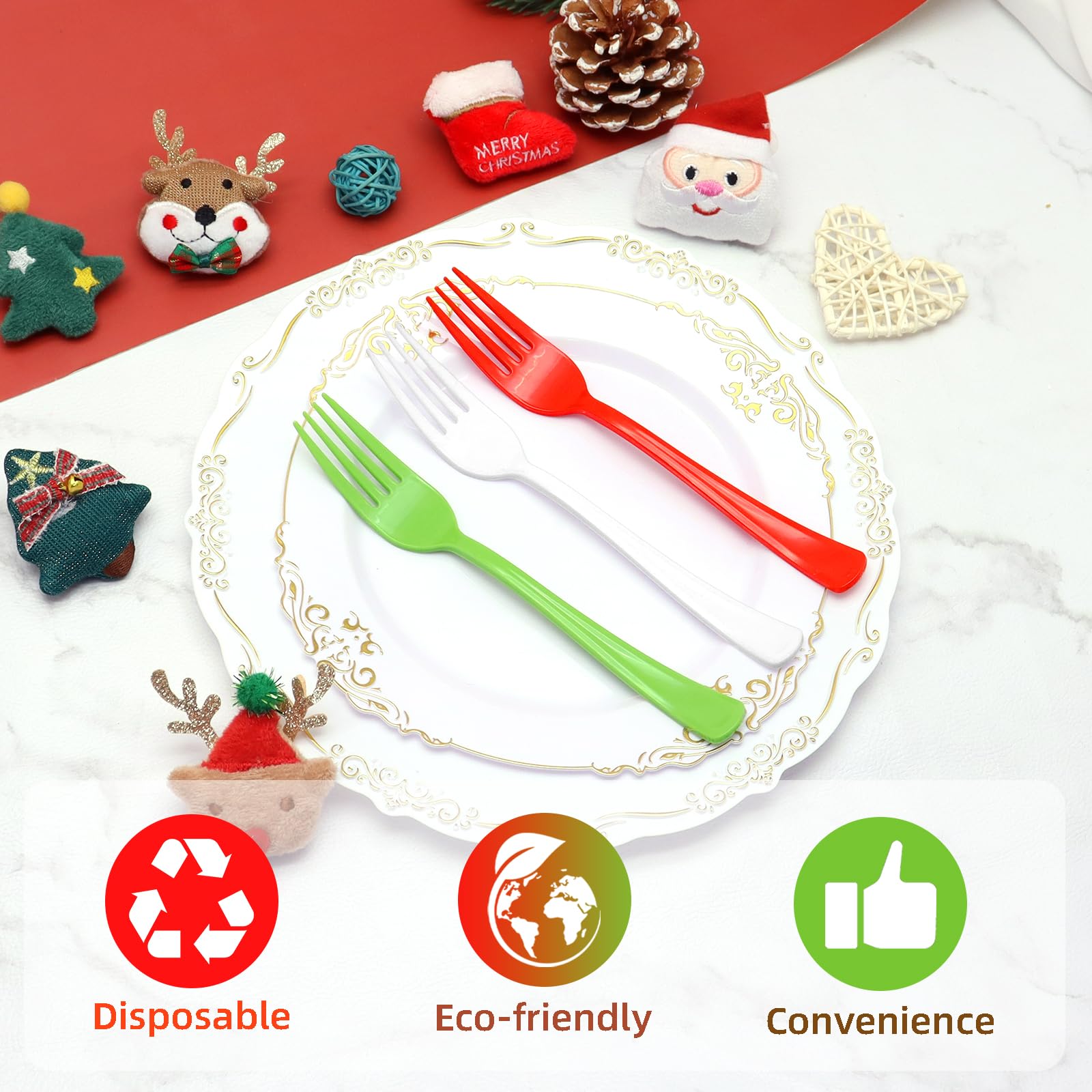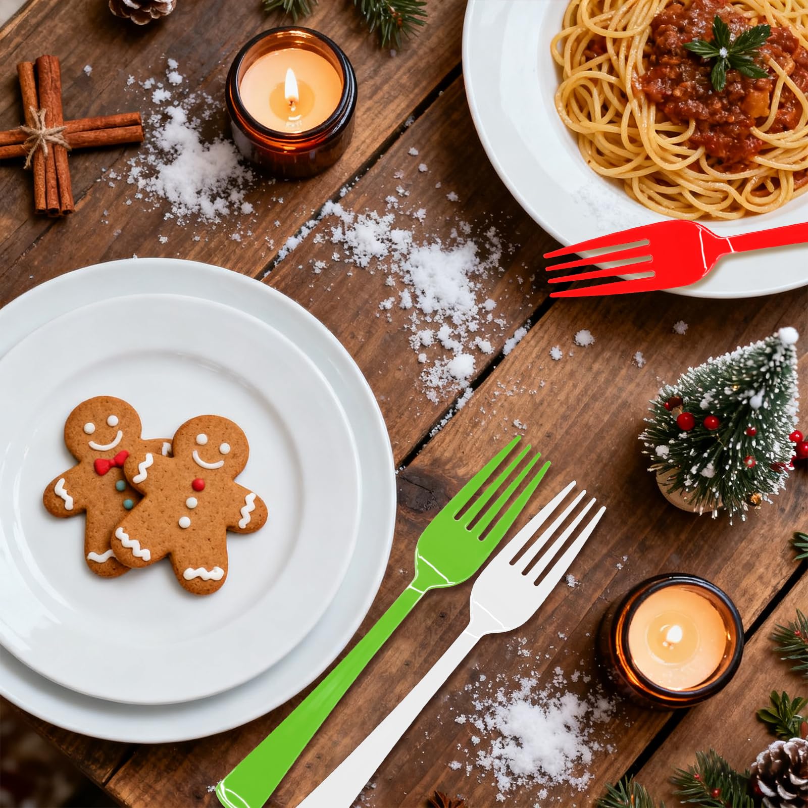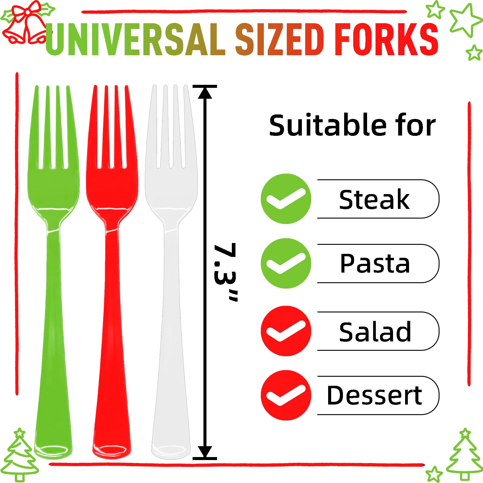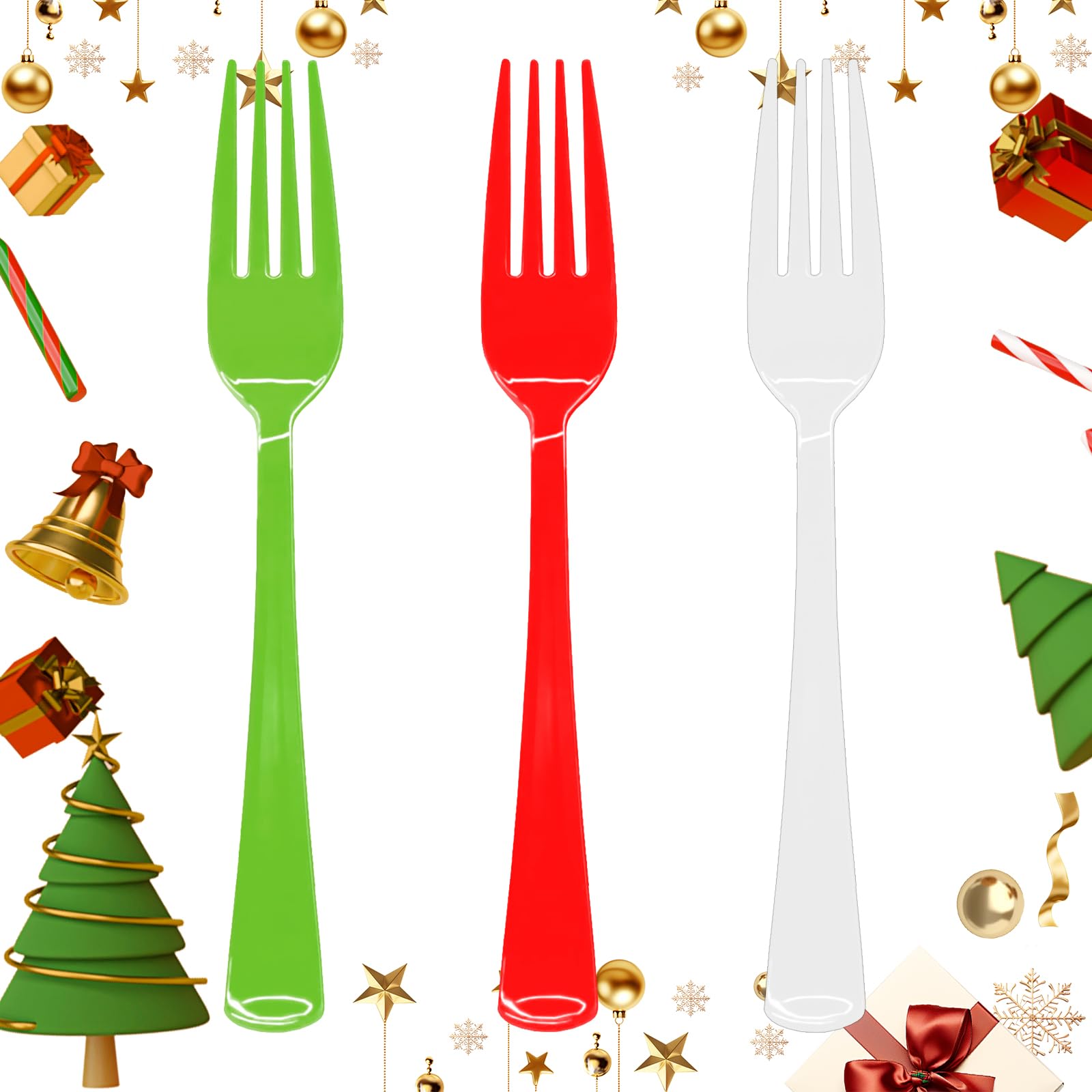 【 Christmas Exclusive Forks 】 : These Christmas plastic forks are specially designed for Christmas. Red represents Santa Claus, green represents Christmas tree, and white represents snowflake - these three colors full of festive elements can instantly enhance the atmosphere of the Christmas party table.