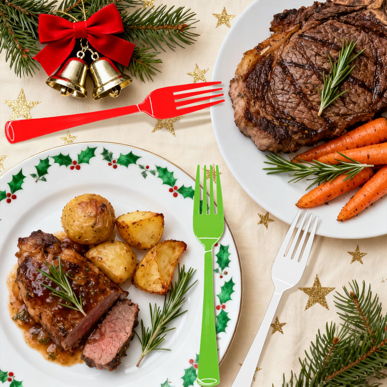 【Sufficient Quantity】:This Christmas plastic fork set includes 20 red plastic forks, 20 bright green plastic forks, 20 white plastic forks, a total of 60 plastic forks, exclusively customized for Christmas. Sufficient quantity to meet the needs of multiple people gathering, different color forks can also be matched with different foods, adding fun to Christmas.