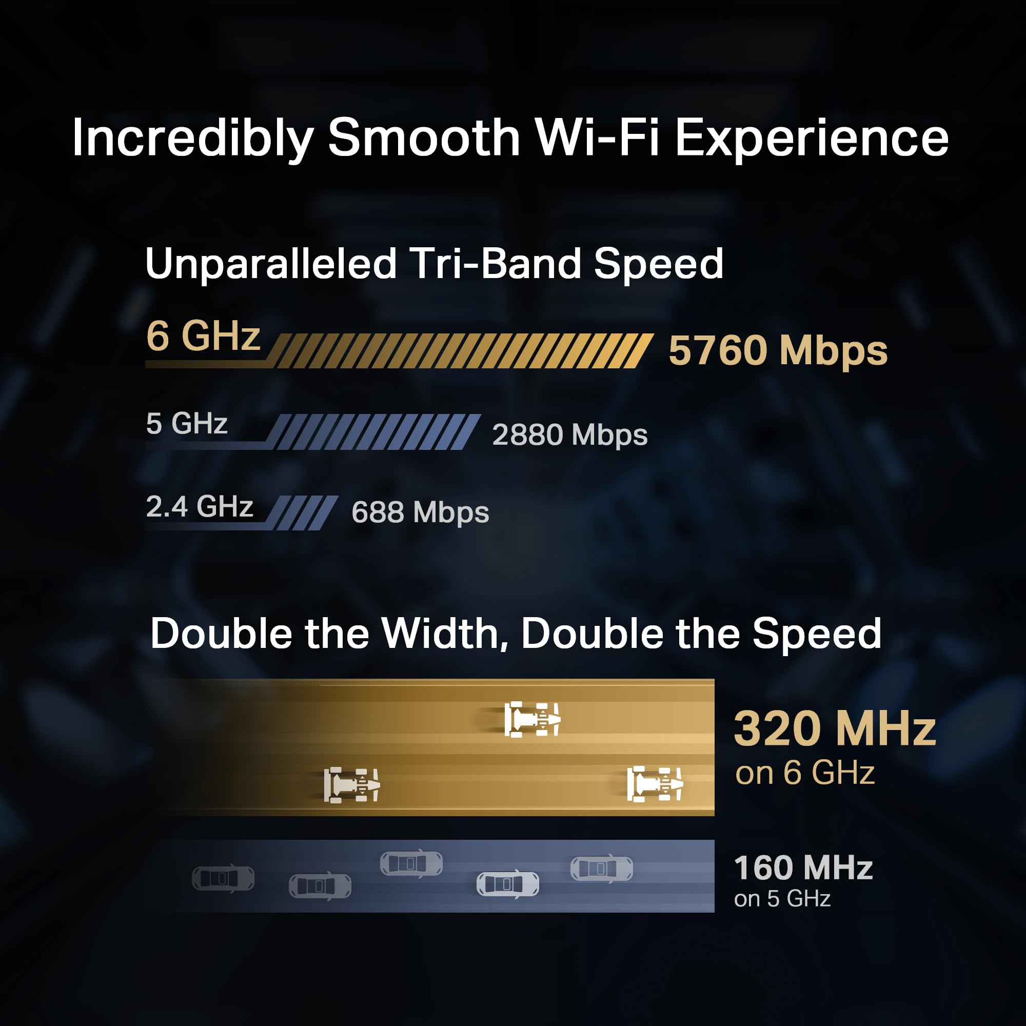 𝐁𝐥𝐚𝐳𝐢𝐧𝐠 𝐅𝐚𝐬𝐭 𝟗.𝟑 𝐆𝐛𝐩𝐬 𝐓𝐫𝐢-𝐁𝐚𝐧𝐝 𝐓𝐨𝐭𝐚𝐥 𝐁𝐚𝐧𝐝𝐰𝐢𝐝𝐭𝐡- Maximize connectivity with extreme speeds up to 5764 Mbps on the 6 GHz band, 2882 Mbps on the 5 GHz band, and 688 Mbps on the 2.4 GHz band.